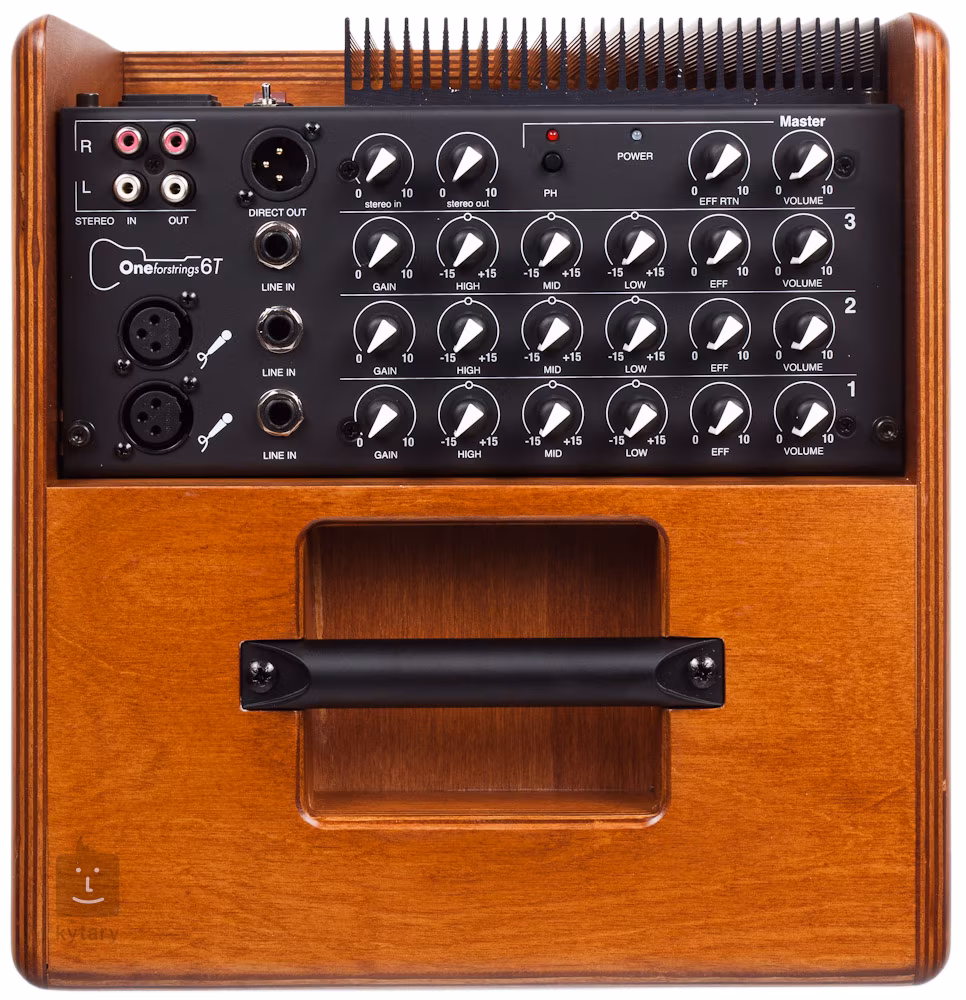 Kombo One-Forstrings 6T nabízí možnost připojit až tři kytary, dva mikrofony a kytaru či dvě kytary a jeden mikrofon. Jde tedy o kombo určené především malým akustickým či folkovým kapelám a písničkářům, protože se zde společnost Acus opět plně soustředí na maximálně věrný přenos akustického zvuku nástroje. Na druhou stranu je však se svým výkonem 130 W už dost výkonné na to, aby si poradilo se středně velkou místností. Pokud by výkon přece jen nestačil, je zde samozřejmě připravený XLR výstup. One-Forstings 6T nabídne samostatné třípasmové ekvalizéry pro každý ze tří kanálů. Mimo těchto ekvalizérů na ovládacím panelu najdeme potenciometry pro hlasitost a Gain všech tří kanálů, Reverb pro každý kanál, hlasitost pro Stereo In i Stereo Out, Reverb Return a hlavní výstupní hlasitost. Kombo nabízí také možnost zapojení kondenzátorových mikrofonů, protože umožňuje fantomové napájení. To se také zapíná na ovládacím panelu. Kombo má také XLR výstup pro zapojení do dalších ozvučovacích zařízení.