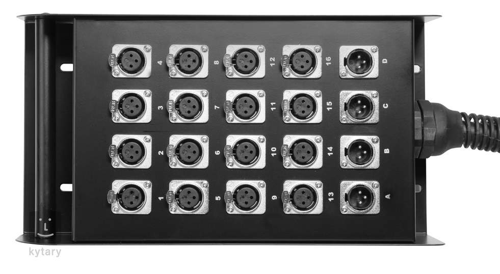 Stagebox je nepostradatelným vybavením pro ozvučení jakékoli akce. Horní panel disponuje zásuvkovým terminálem se 16 vstupními kanály (XLR F) a 4 výstupními kanály (XLR M). Masivní ocelové šasi je vybaveno praktickým držadlem pro přenášení.