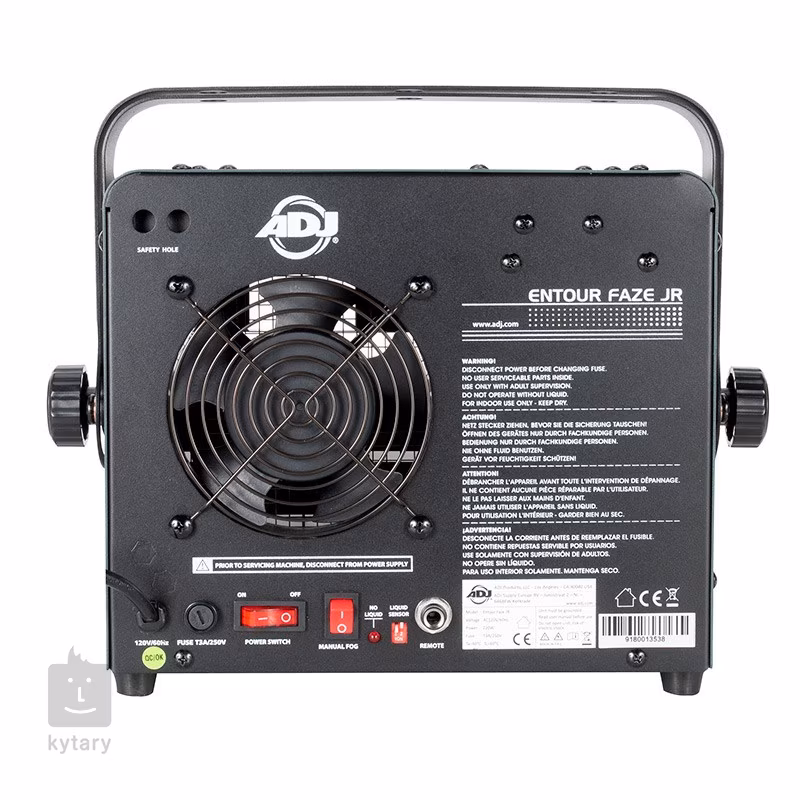 Entour Faze JR je možné ovládat spínačem na zadní straně stroje, případně pomocí dálkového ovladače Entour VT-1, který je součástí balení. Výrobník dále disponuje unikátním dvojitým závěsným systémem s možností šikmého zavěšení. Výrobce doporučuje použít lehčí směs, např. ADJ F4L ECO.