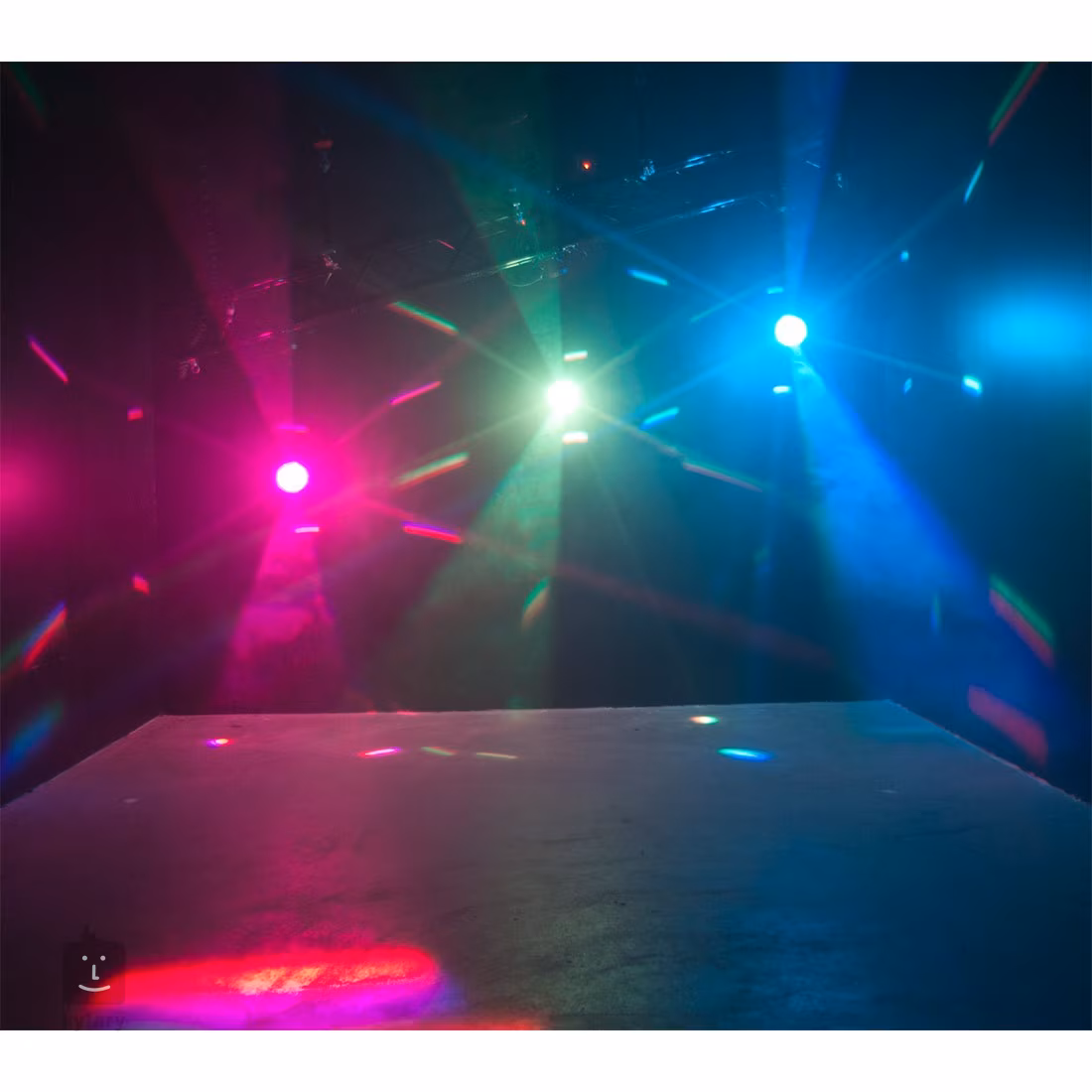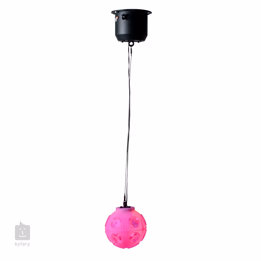 - Pomalu se otáčející koule, která vytváří 2 efekty v 1: svítící transparentní plášť + ostré paprsky RGB světla