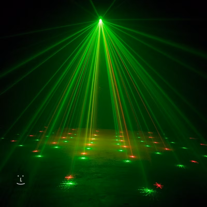 - Vytváří přes 200 zelených a červených laserových paprsků, které lze promítat na strop, zeď, či taneční parket