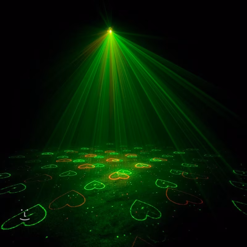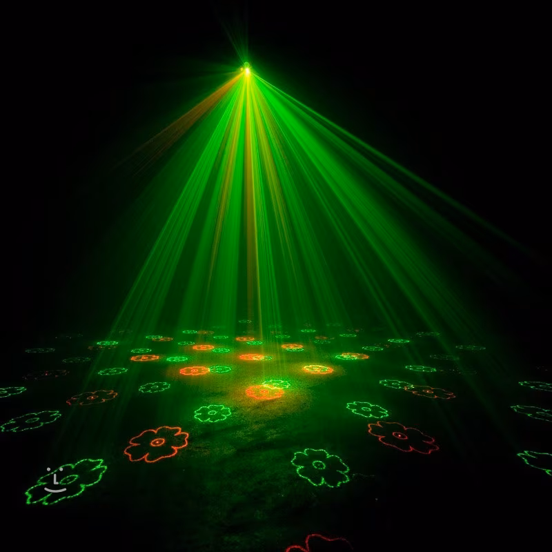 - Vytváří přes 200 zelených a červených laserových paprsků s gobo vzory, které lze promítat na strop, zeď, či taneční parket