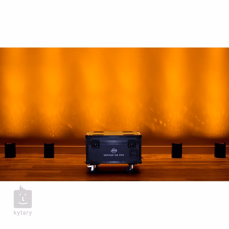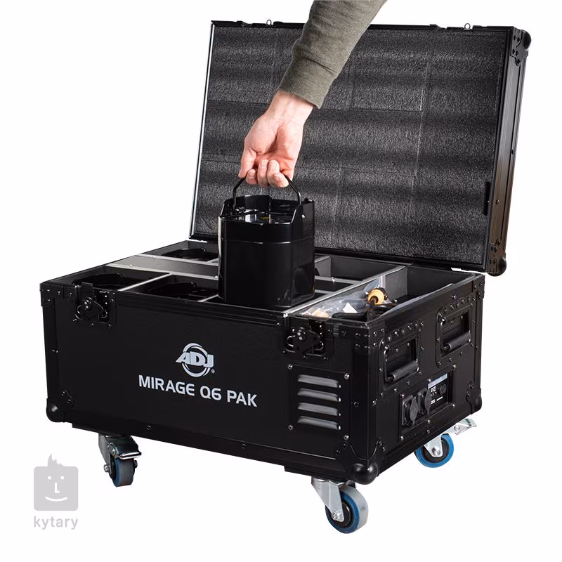 Sada světel Mirage Q6 Pak Black od společnosti ADJ obsahuje šest reflektorů Mirage Q6, na míru vytvořený flight case, šest napájecích stanic a adaptérů, IR ovladač a napájecí kabel s vysokým stupněm ochrany IP65. Celková hmotnost sady je 44 kg, rozměry flight casu jsou 671 x 461 x 459 mm.