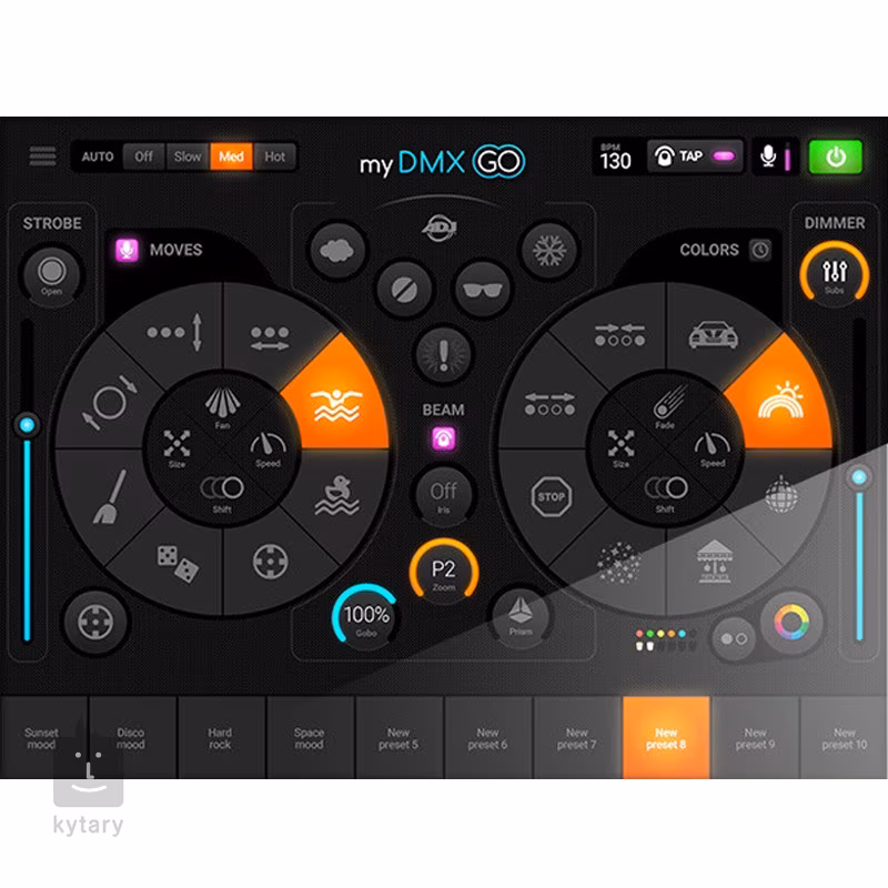 Aplikace MyDMX GO nabízí uživatelsky přívětivé rozhraní, které vám umožní ovládat 256 DMX kanálů, volit z 21 automatických efektů a ukládat si svá oblíbená nastavení do 50 presetových slotů. K dispozici je také barevný kotouč pro volbu barev a mixovací paleta RGB. Samozřejmostí je tlumení světla, stroboskopický efekt, nastavení rychlosti barevných sekvencí, funkce fade a řada dalších. Zkrátka vše, co potřebujete pro vytvoření působivé světelné show. Převodník se k aplikaci připojuje prostřednictvím WiFi nebo USB-C (USB připojení je vhodné pouze pro zařízení s operačním systémem Android). Pro využití iPadu je vyžadována přinejmenší verze iPadOS 13.