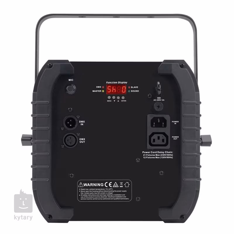 K ovládání zařízení můžete využít standardní protokol DMX512 nebo přehledný ovládací panel na zadní straně přístroje s displejem a tlačítky. K dispozici jsou tři ovládací režimy – DMX, automatický Show Mode nebo režim zvukového ovládání. Využít můžete Stand Alone konfigurace nebo modu Primary/Secondary. Bezdrátové ovládání je možné s pomocí infračervených ovladačů UC IR nebo Airstream IR, které však nejsou součástí balení. Přístroj je osazen 3pinovými DMX konektory a napájecími konektory IEC. Součástí balení je montážní držák pro montáž na nosnou konstrukci.