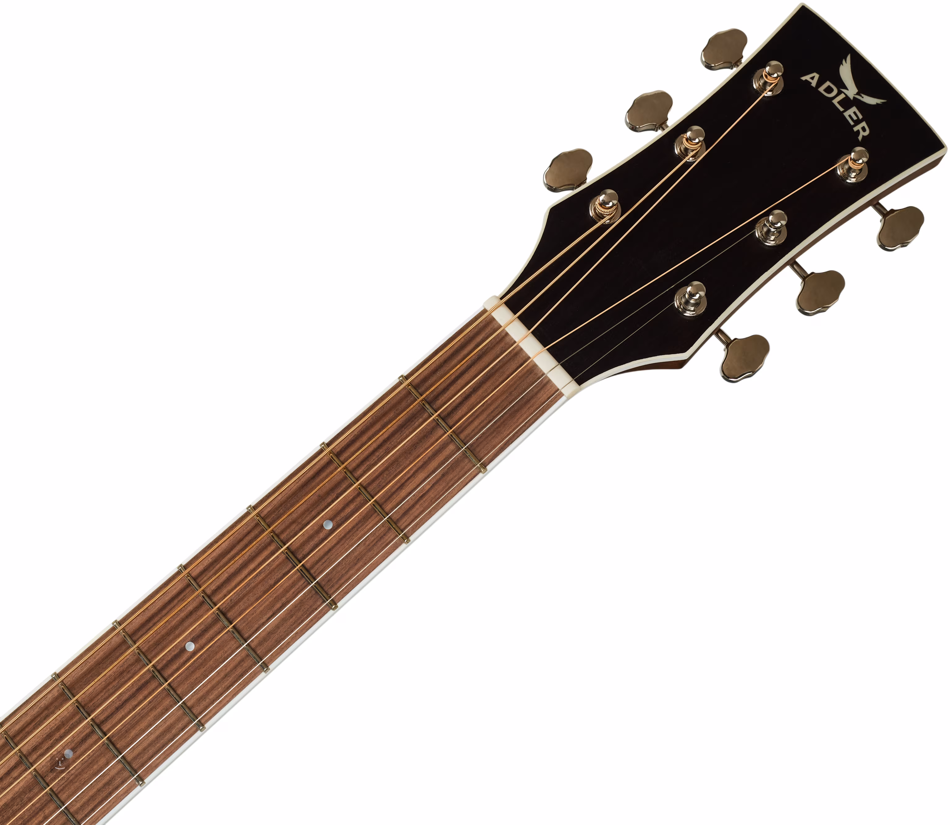 Elektroakustická kytara GE100-SR značky Adler Guitars je nástroj s moderním tvarem Grand Auditorium vhodným pro hru prsty (fingerpicking) i trsátkem.