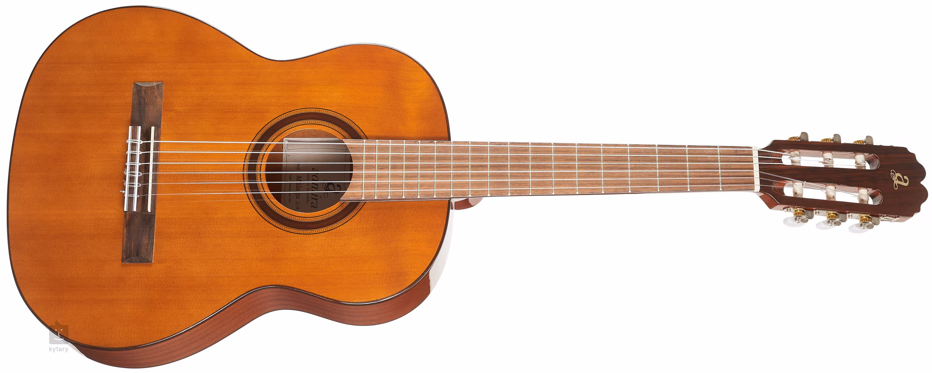 Admira Málaga (ADM054034) je cenově dostupná dětská klasická kytara v 3/4 velikosti vhodná pro mladé začínající kytaristy a studenty hudebních škol. Nabízí polomasivní konstrukci s přední deskou z masivu cedru a zadní deskou a luby z vrstveného sapele. Tělo kryje lesklý lak. Ke krku z afrického mahagonu je přilepen hmatník ze dřeva kabukalli. Struny jsou uchyceny v klasických niklových ladících mechanikách a kobylce z kabukalli. Stylové zpracování podtrhují tradiční prvky v podobě rozety, lemovky a firemního loga na hlavici.