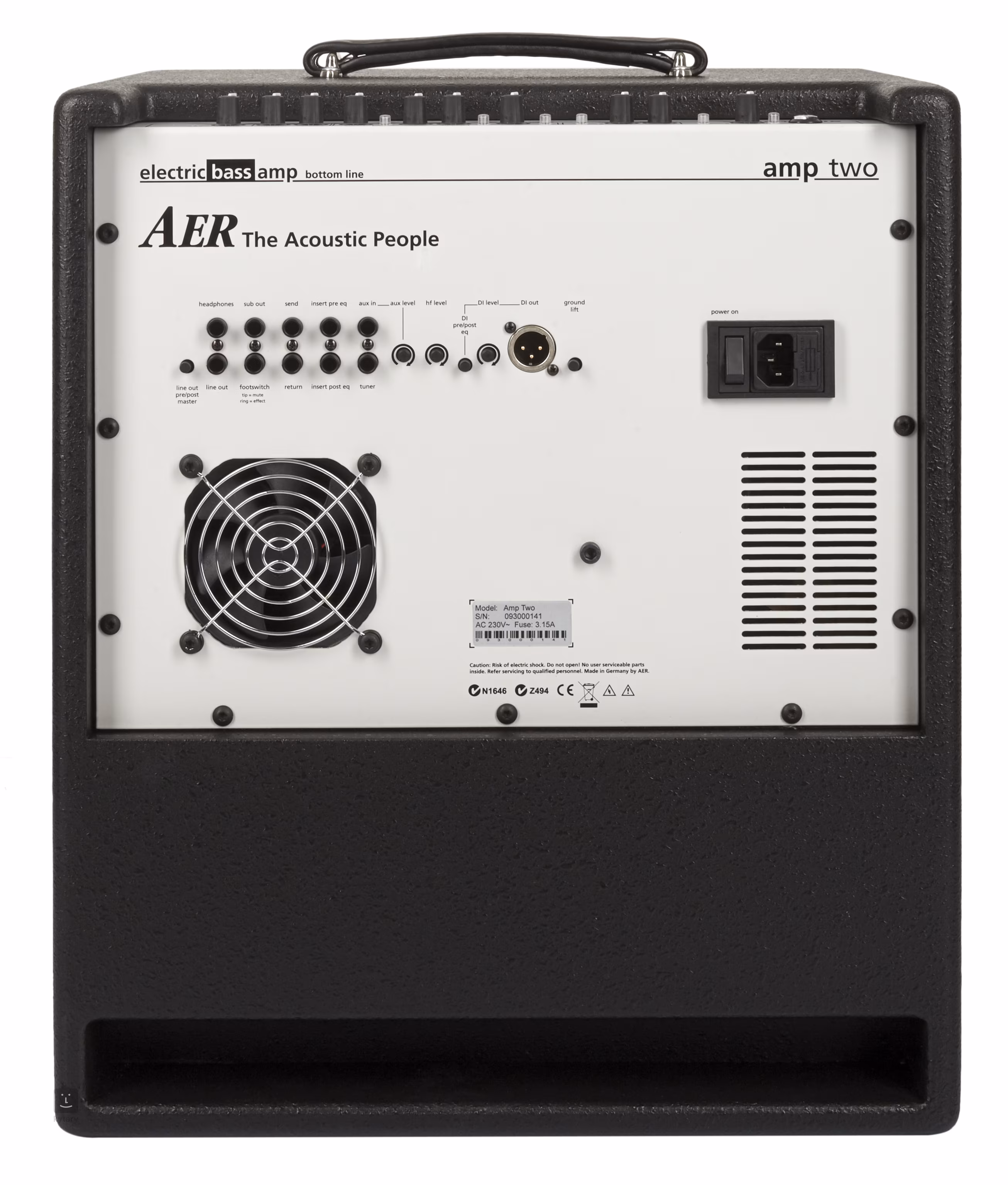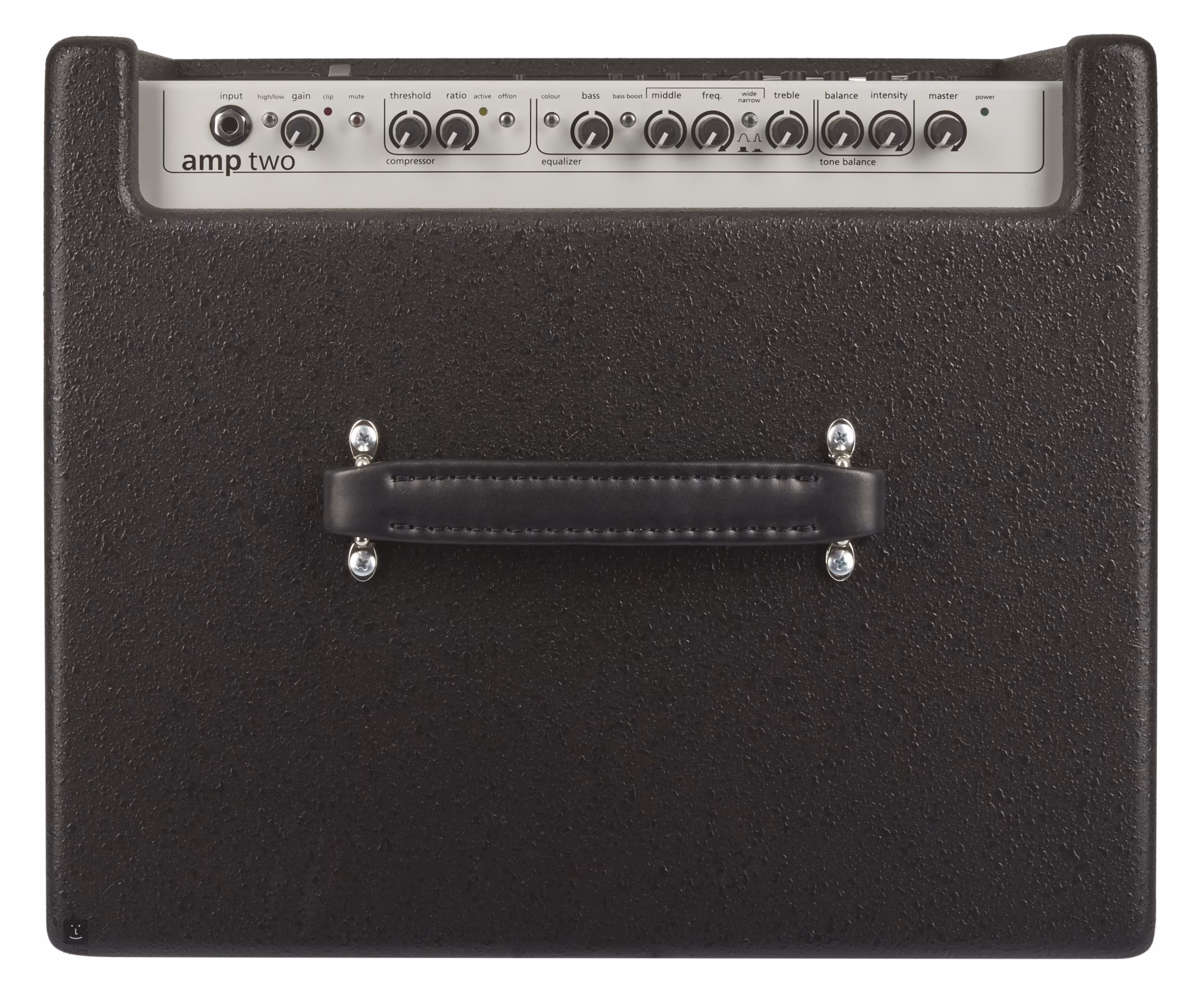 Amp Two je největším z basových aparátů z produkce firmy AER, tomu odpovídá i výkon 240 wattů. Jedná se o jednokanálové baskytarové kombo s velkým zvukem; ať už v basových nebo výškových frekvencích. Jeho jednoznačnou předností jsou široké možnosti zvukových nastavení. Barvu tónu můžete ovlivnit jak nastavitelnými zvukovými filtry, tj. třípásmovým parametrickým ekvalizérem a sekcí Tone Balance, tak i fixními, tj. tlačítky Colour a Bass Boost. Máte tak k dispozici dostatek možností, jak podpořit zvuk baskytary a dodat mu další zvukový rozměr. Dynamiku signálu snadno upravíte pomocí integrovaného kompresoru. Ten je na rozdíl od ostatních dvou modelů (amp one/three) umístěn před sekcí EQ.