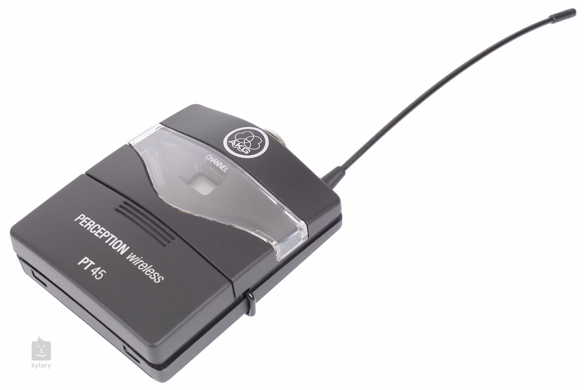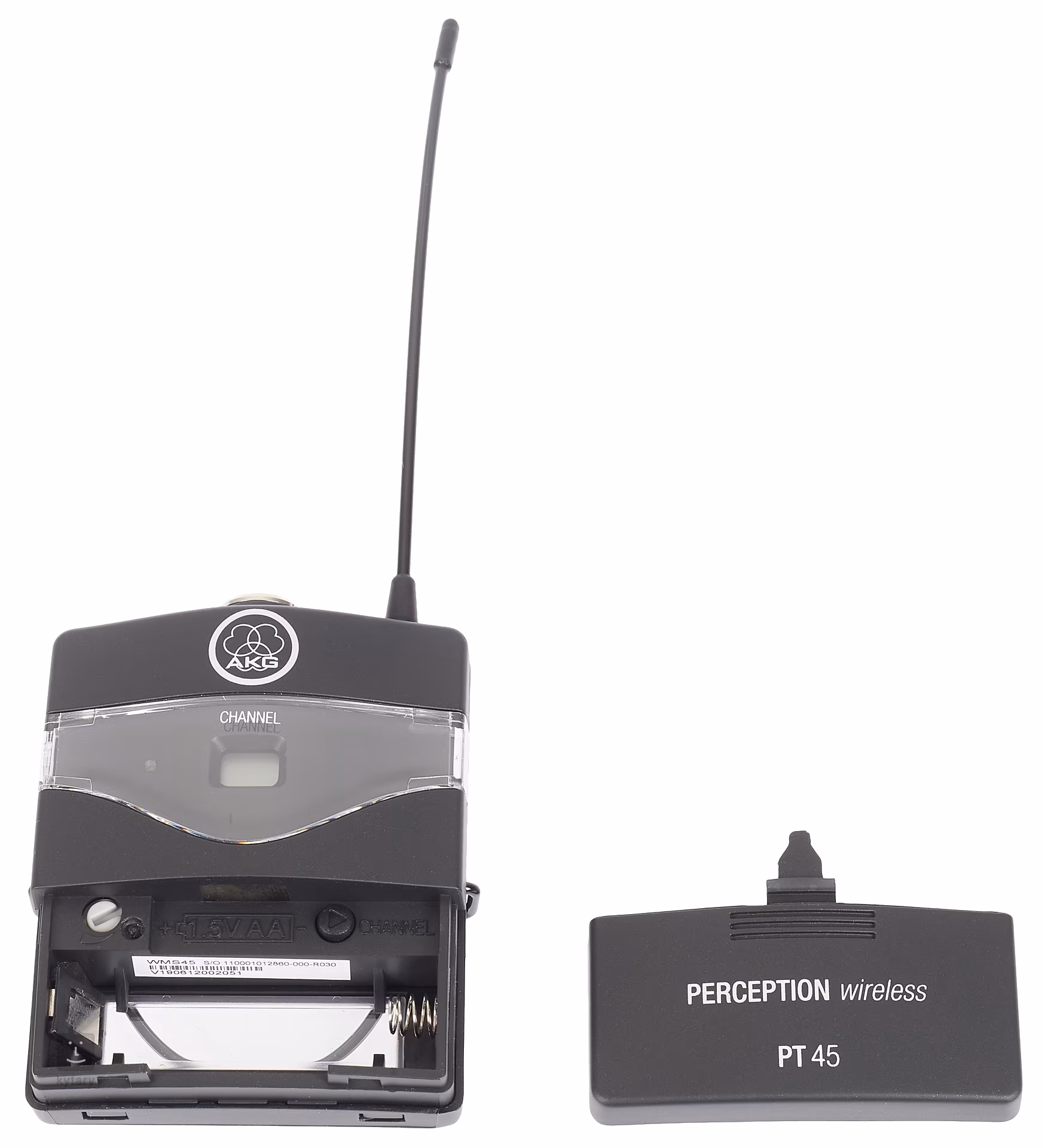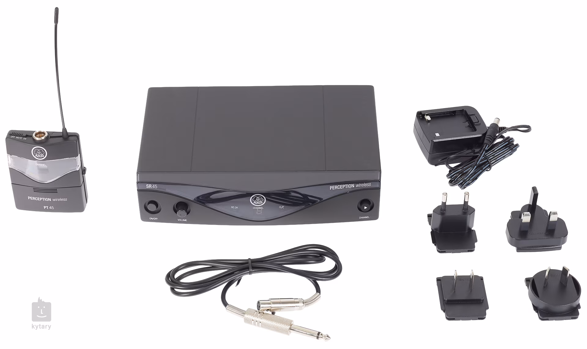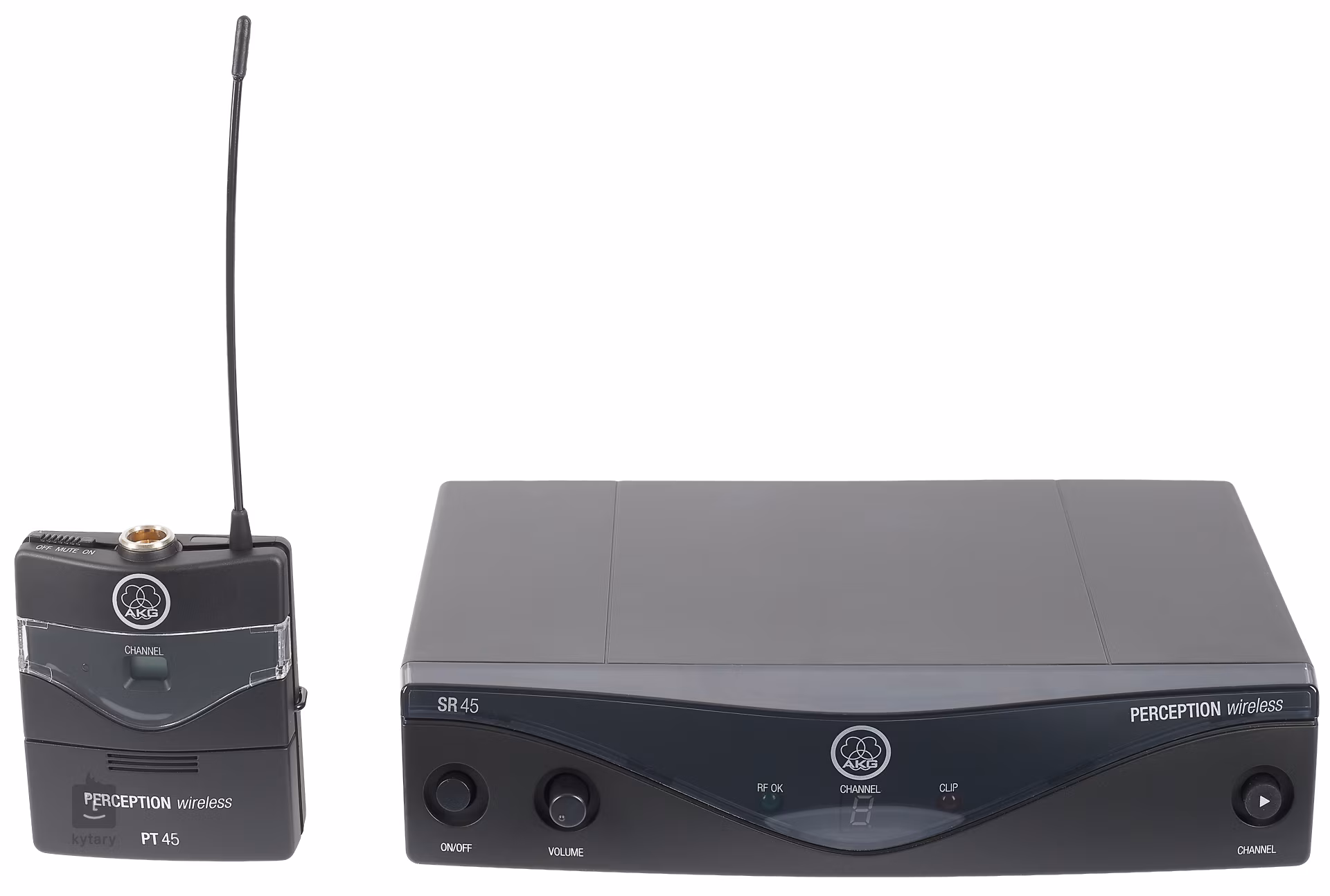 Součástí setu AKG Perception Wireless Instrumental Set je přijímač AKG SR45 a bodypack AKG PT45. Přijímač má na svém šasí minimum ovládacích prvků, přesto není nastavování parametrů nijak ochuzeno. K ovládání slouží potenciometr Volume, tlačítko Channel pro přepínání kanálů, LED displej zobrazující zvolený kanál, LED indikátory signálu a clippingu, vypínač a trimr pro nastavení squelche. Výstupy jsou osazeny XLR a 1“ Jack konektory. Bodypack PT45 je vůbec nejmenším a nejlehčím vysílačem ve své třídě a kromě toho je kompatibilní s miniaturními mikrofony AKG MicroMics, které umožňují kvalitní ozvučení všech běžných nástrojů. PT45 je vybaven displejem, LED indikátorem stavu baterie a vypínačem, pod krytkou baterie najdeme přepínač kanálů a trimr pro nastavení vstupní úrovně. Bodypack je napájen jednou AA baterií, na níž dosahuje životnosti až 10 hodin.