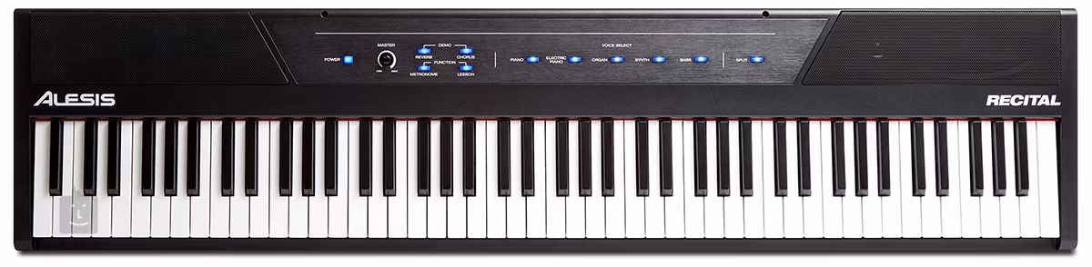 Alesis Recital je plnohodnotné digitální piano s 88 polovyváženými klávesami s nastavitelnou citlivostí. Pět realistických zvuků (akustické a digitální piano, varhany, syntezátor, kontrabas) lze po dvojicích kombinovat v režimu Layer a režim Split umožňuje rozdělení klaviatury na dvě části s tím, že v každé z nich zní jiný nástroj. Integrované prostorové efekty Chorus a Reverb dají realistickým zvukům ještě větší hloubku. Pro cvičení ve dvojici nebo s učitelem je praktický režim Lesson, kdy se klaviatura rozdělí na dvě totožné části, takže zvuk i výšky tónů zůstávají stejné. Alesis Recital je vybavený vstupem pro sustain pedál a výstupy pro sluchátka (Jack 6,3 mm) nebo jiné zvukové systémy včetně mixážního pultu. Propojení se softwarem nebo virtuálními nástroji je dále možné prostřednictvím USB-MIDI výstupu.