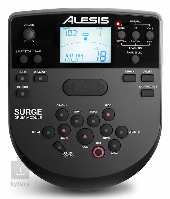 Důležitou součástí setu je samozřejmě modul Surge, který obsahuje zvuky sedmdesáti bicích sad s šesti sty zvuky a šedesáti zabudovanými tracky, které můžete doprovázet. Samozřejmostí je zabudovaný metronom a 3,5 mm jack pro připojení vašich audio zařízení, s kterými můžete jamovat. Nechybí stereo výstup, výstup pro sluchátka, vstup pro externí zařízení typu CD nebo mp3 přehrávačů a USB, díky kterému můžete kit používat jako kontrolér softwaru.