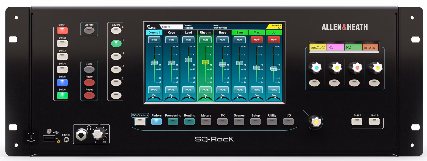 SQ Rack je vybaven celkem 48 kanály a 36 sběrnicemi (busses), jeho ovládacímu panelu vévodí dotykový 7” displej s HD rozlišením a k dispozici je také řada tlačítek a potenciometrů. Co na předním panelu nenajdete, jsou táhla, veškeré vstupní a výstupní úrovně však snadno nastavíte na přehledném displeji nebo pomocí dedikované aplikace SQ-Control, která vám umožní upravovat mix i na dálku a přizpůsobit tak kvalitu zvuku ve všech koutech hudebního klubu či arény. Každý ze vstupů je vybaven high-pass filtrem, čtyřpásmovým parametrickým EQ, kompresorem a dalšími funkcemi pro úpravu zvuku. K dispozici je také 8 stereo efektových enginů se simulacemi legendárních delay efektů, reverbů, modulačních efektů a mnoha dalších.