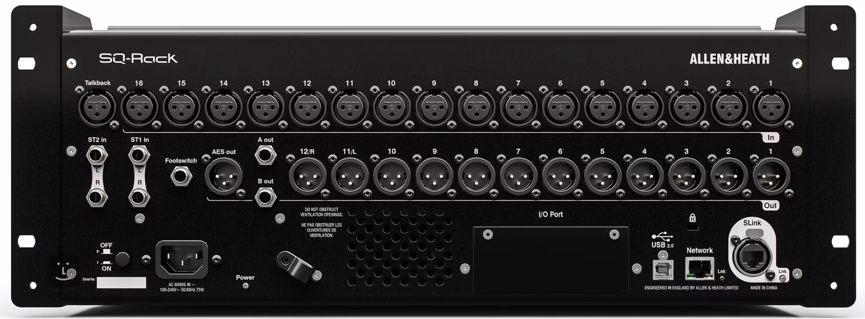 Zařízení disponuje celkem 16 XLR vstupy (+ Talkback), 3 stereo linkovými vstupy, 12 XLR výstupy a 2 jackovými výstupy (6,3 mm). K dispozici je také jeden AES Out a výstup pro externí footswitch. Pro účely rozšíření konektivity je zde také SLink konektor, s jehož pomocí můžete mixpult rozšířit o jakýkoliv hardware z dílny Allen&Heath. K dispozici je také jeden slot pro rozšiřující zvukové karty Dante, Waves, MADI a mnoho dalších. Díky těmto rozšířením vám SQ Rack nabídne širokou škálu možné konektivity, o které si mnozí mohou nechat jen zdát.