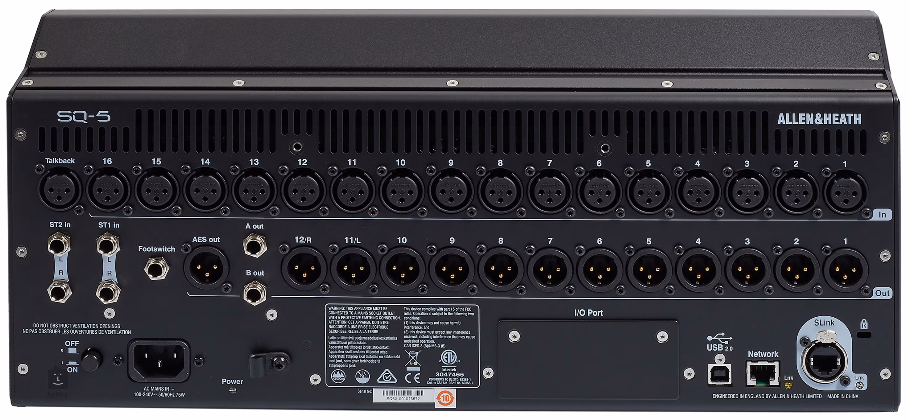 Až 48 mikrofonů Mixážní pult SQ-5 je vybaven všemi vstupy a výstupy pro okamžitou práci. Díky “chytrému” SLink portu jsou podporovány již existující racky, expandéry a stage boxy (AB168, AR2412, AR84 - pouze 48kHz, a nebo DX168 se kterým plně využijete 96kHz technologie), díky tomu je rozšíření fyzických vstupů a výstupů velice snadné. SQ je možné dokonce připojit do dalšího SQ nebo dokonce systému dLive.