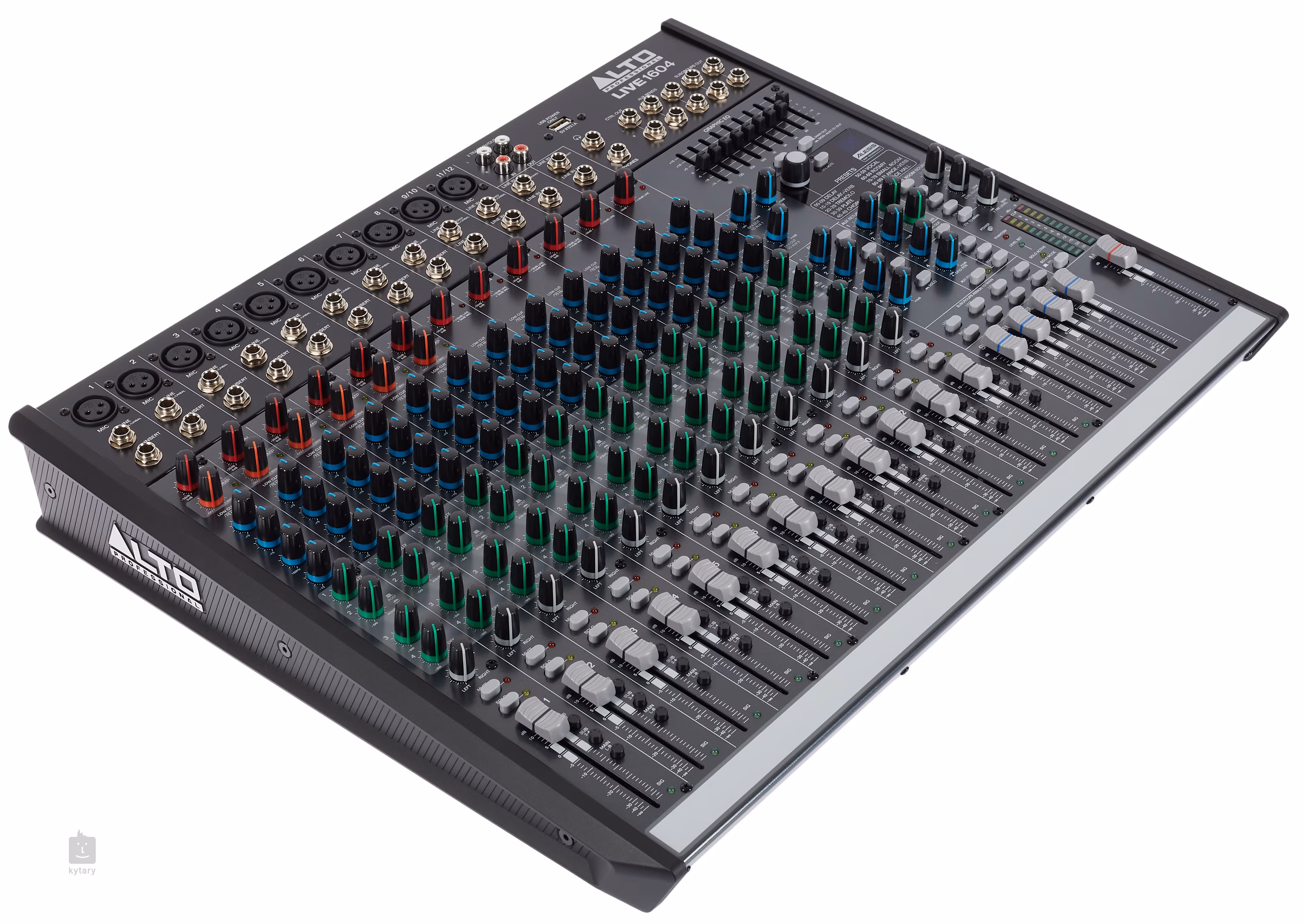 Alto Live 1604 Šestnáctikanálový mixpult je skvělou volbou pro velké kulturní eventy, konference nebo studia. Obsahuje deset mikrofonních vstupů s fantomovým napájením, kde můžete dále upravit vstupní signál prostřednictvím třípásmového ekvalizéru. 1-6 vstup navíc obsahuje výkonný kompresor. Další vstupy potom obsahují stereo konektivitu s ovladači Gain/Balanced, třípásmovým EQ a pro připojení CD/MP3 přehrávače lze využít stereo Jack/RCA konektory.