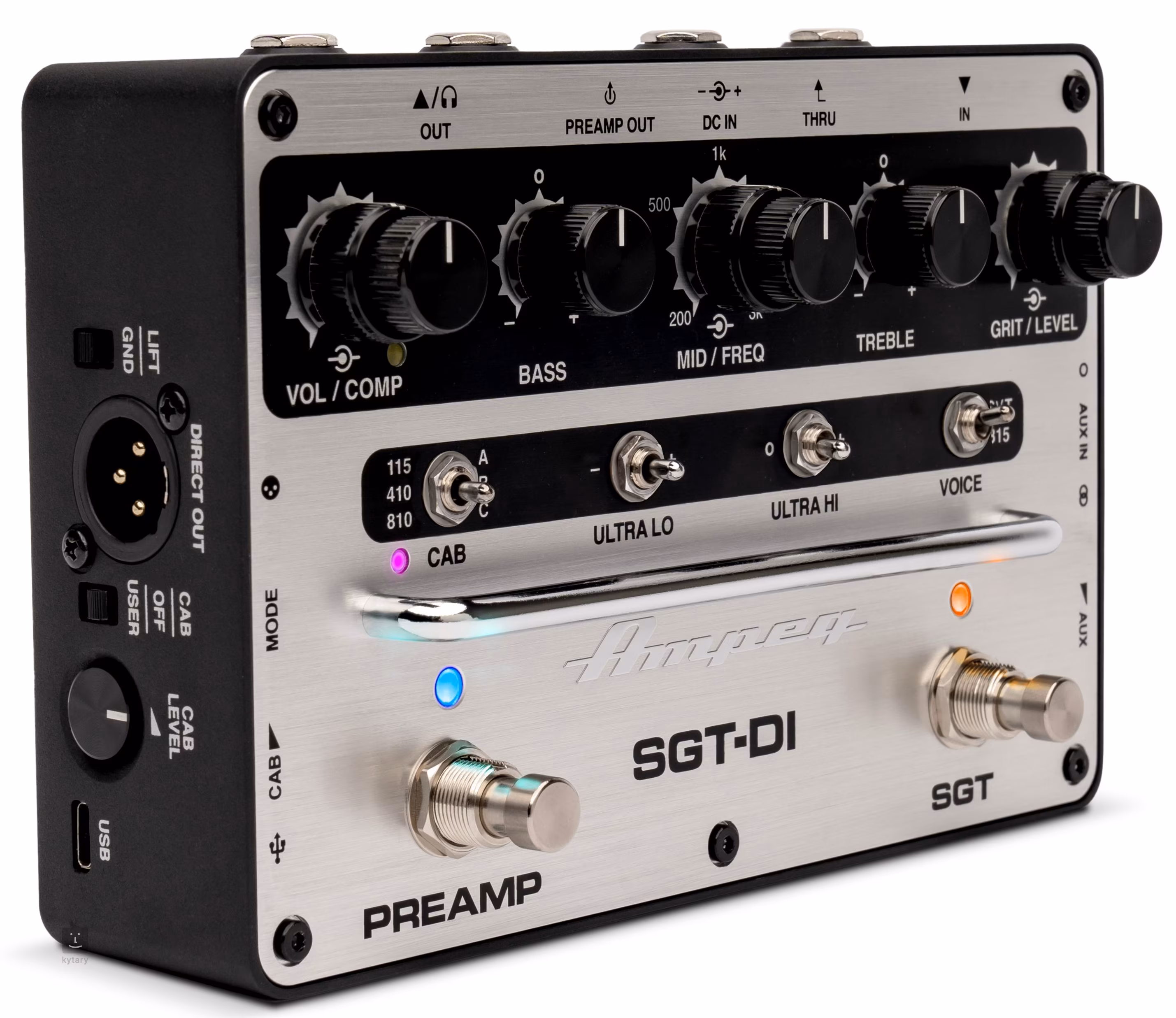 Basový preamp Ampeg SGT-DI je kompaktní a všestranný pedálový předzesilovač a direct box, který nabízí kvalitní zvuk a pokročilé funkce pro basisty. Přístroj je vybaven preampem s aktivními třípásmovými korekcemi, semi-parametrickými středy a páčkovými switchy Ultra Hi / Ultra Lo pro úpravu nízkých a vysokých pásem. Dále obsahuje duální souosý potenciometr pro ovládání celkové výstupní úrovně a kompresoru, stejně jako potenciometr zkreslovacího obvodu SGT. Předzesilovač nabízí volbu voicingových režimů ve stylu lampových aparátů SVT nebo B15 a integrovaný patentovaný drive SGT (Super Grit Technology).