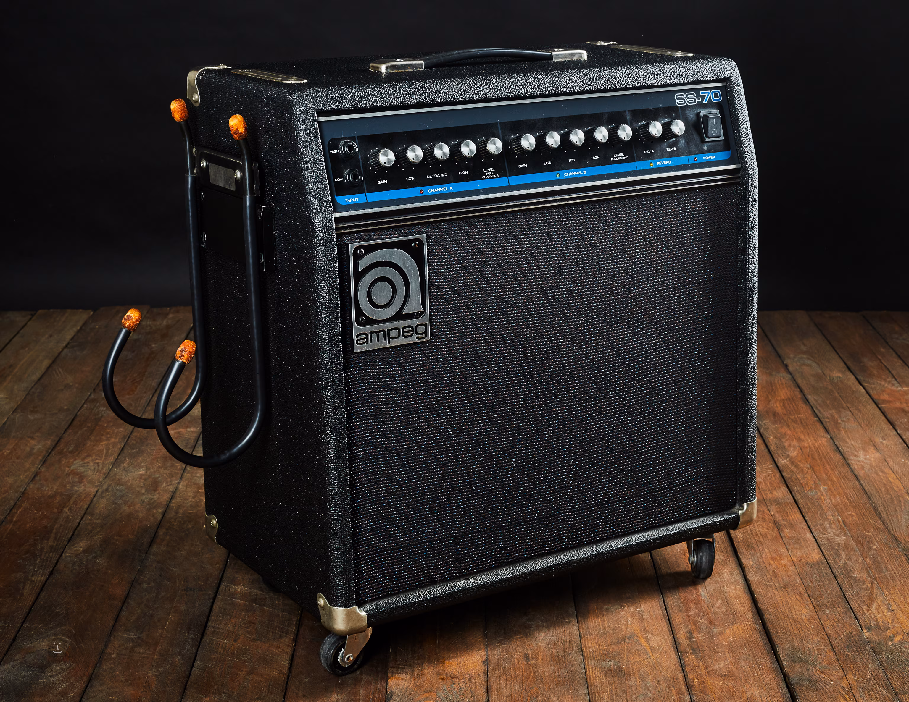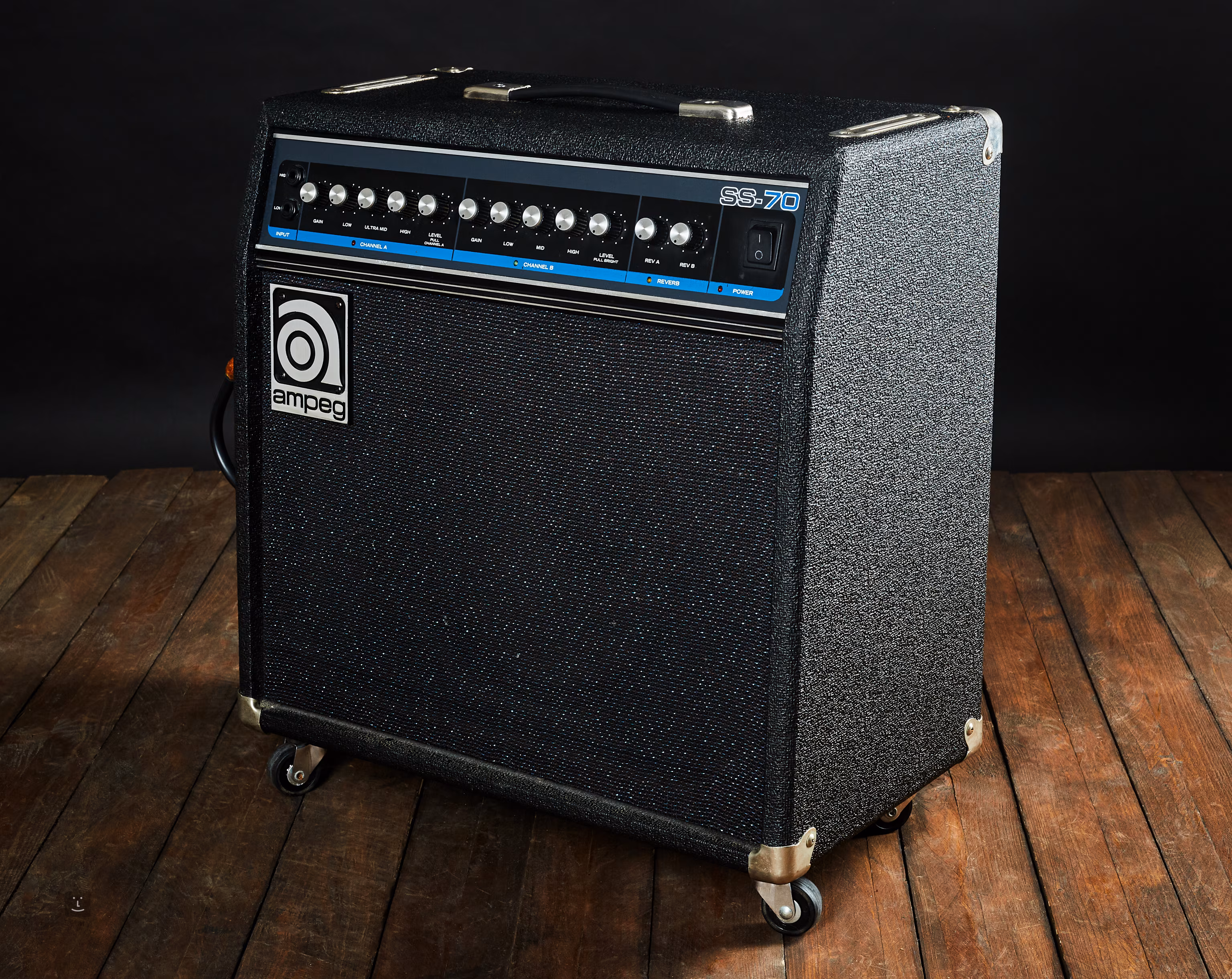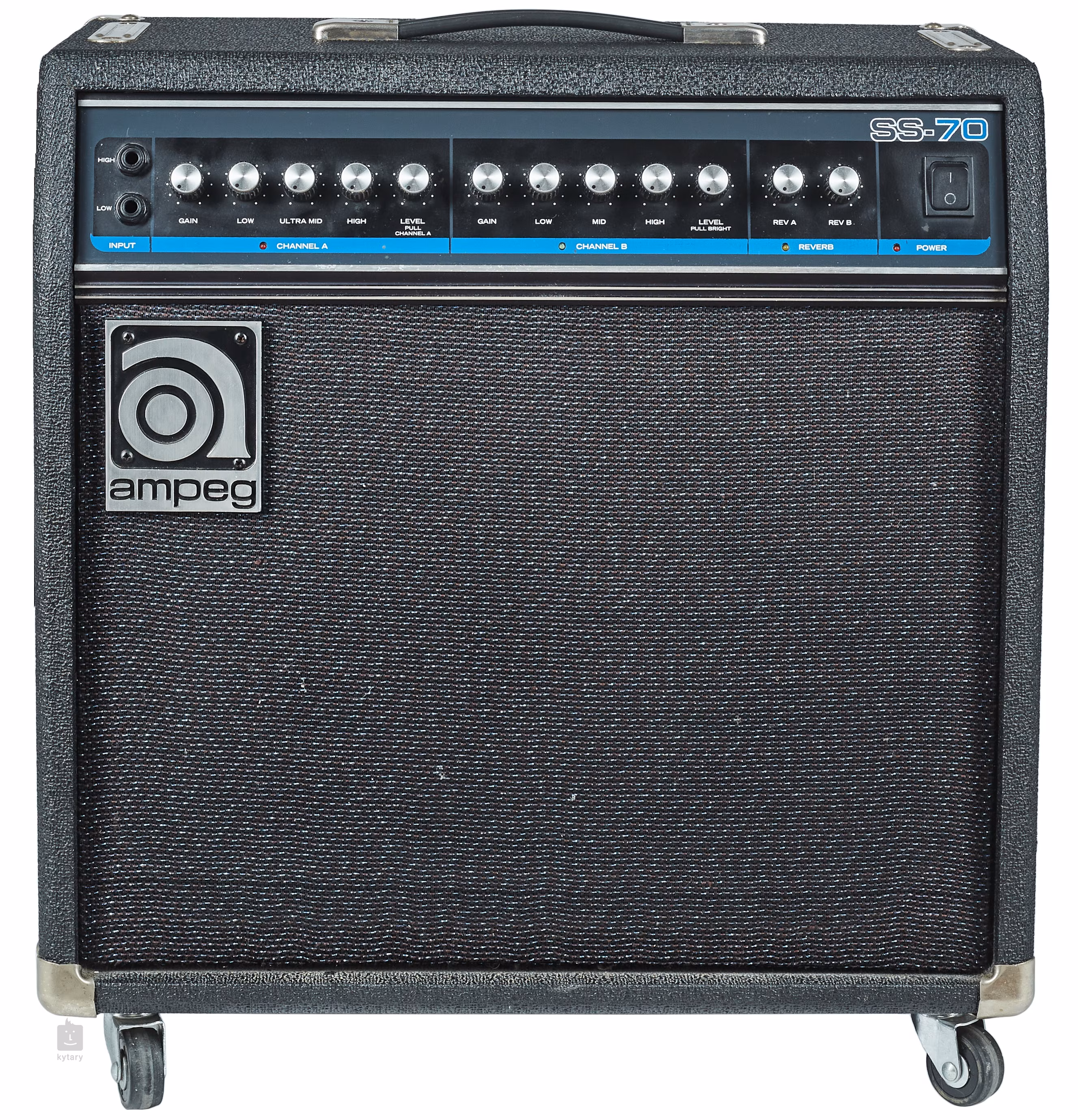 Absolutně perfektní stav. Ze strany je přidělaný odejímatelný stojánek na kytaru (pro hráče tanečního orchestru, kde byl aparát minimálně hraný) a kolečka.