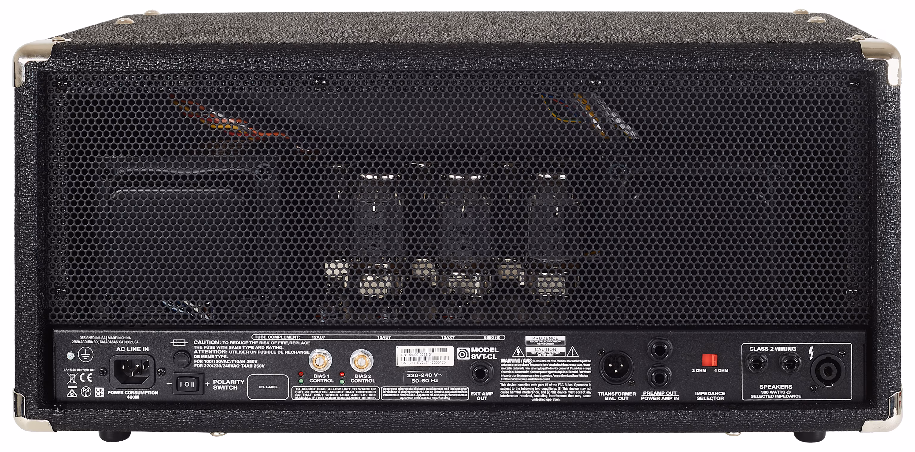 Na zadním panelu je umístěn přepínač polarity, aby se dalo vyhnout nežádoucímu brumu, prvky pro nastavení BIASu, výstup Slave-Out, ze kterého jde stejný signál, který vstupuje do powerampu, symetrický XLR Line-Out a konektory Preamp-Out a Poweramp-In. Ty slouží k tomu, aby bylo možné získat signál z preampu bez odpojení koncového zesilovače nebo naopak poslat do koncového zesilovače signál z jiného preampu a preamp SVT bypassovat. Poslední jsou tři konektory pro připojení reproboxů – jde o jeden Speakon a dva 6,3 jacky. Aparát je koncipován tak, aby pracoval se zátěží 4 nebo 2 ohmů, tudíž je možné připojit například boxy v konfiguraci 2x 8 Ohm, 2x 4 Ohm, 1x 2 Ohm nebo 1x 4 Ohm. Impedance je přepínatelná switchem umístěným u výstupů.