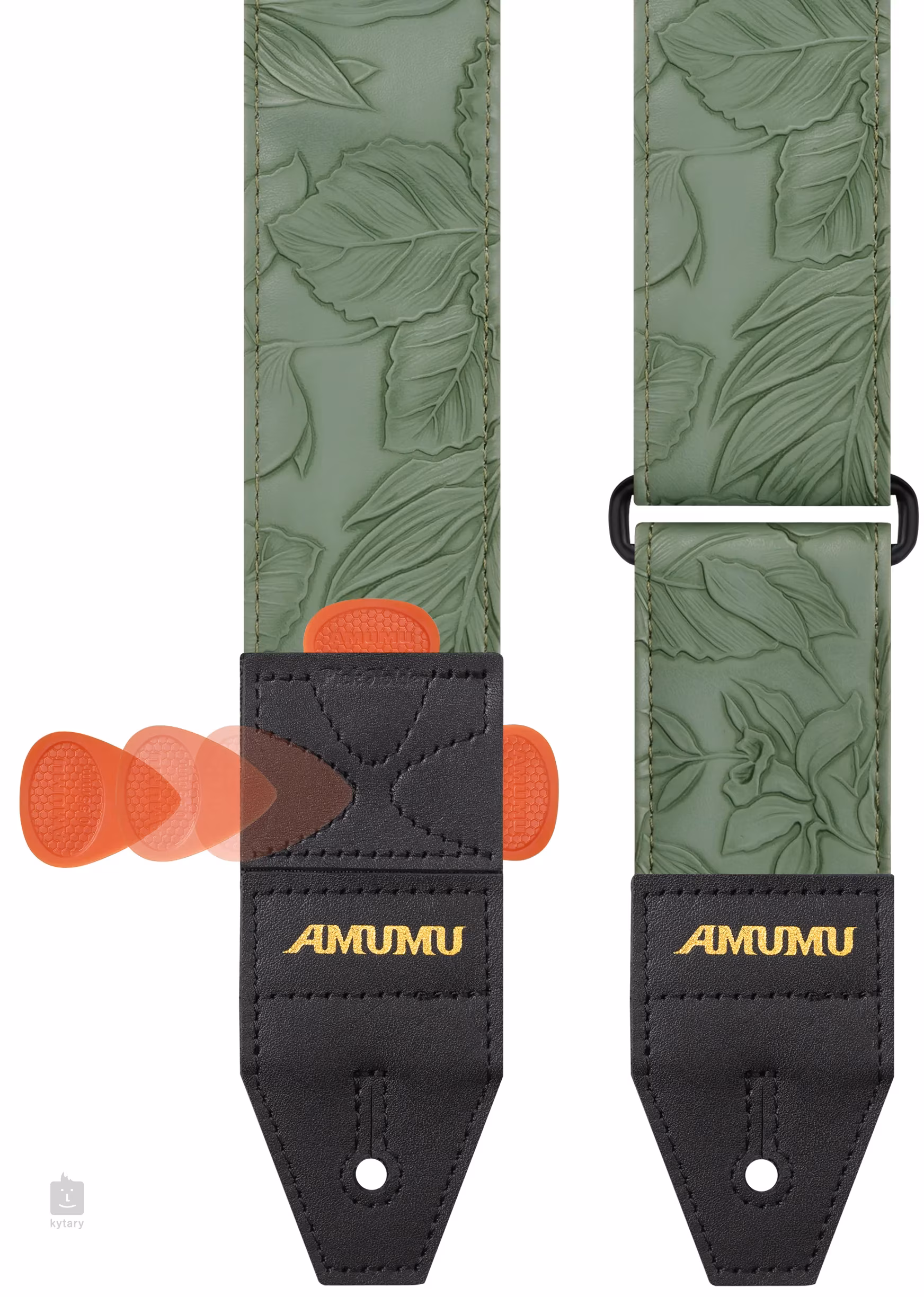 Kytarové popruhy značky AMUMU jsou známé svou odolností, spolehlivostí a kvalitou provedení. Díky široké nabídce modelů a barev si mezi nimi vybere opravdu každý. Popruh Embossed Leaf Green je vyroben ze zelenkavého koženkového materiálu, který je zdoben lístky. Koženka je podšita poddajným bavlněným materiálem, který zajišťuje flexibilitu a celodenní komfort. Kvalitní koncovky z pravé kůže se pak starají o spolehlivé uchycení popruhu k nástroji a jeho dlouhou životnost. Pro větší praktičnost je jedna z koncovek navíc vybavena třemi držáky na trsátka, které vám přijdou vhod, když uprostřed koncertu nebo cvičení omylem upustíte trsátko.