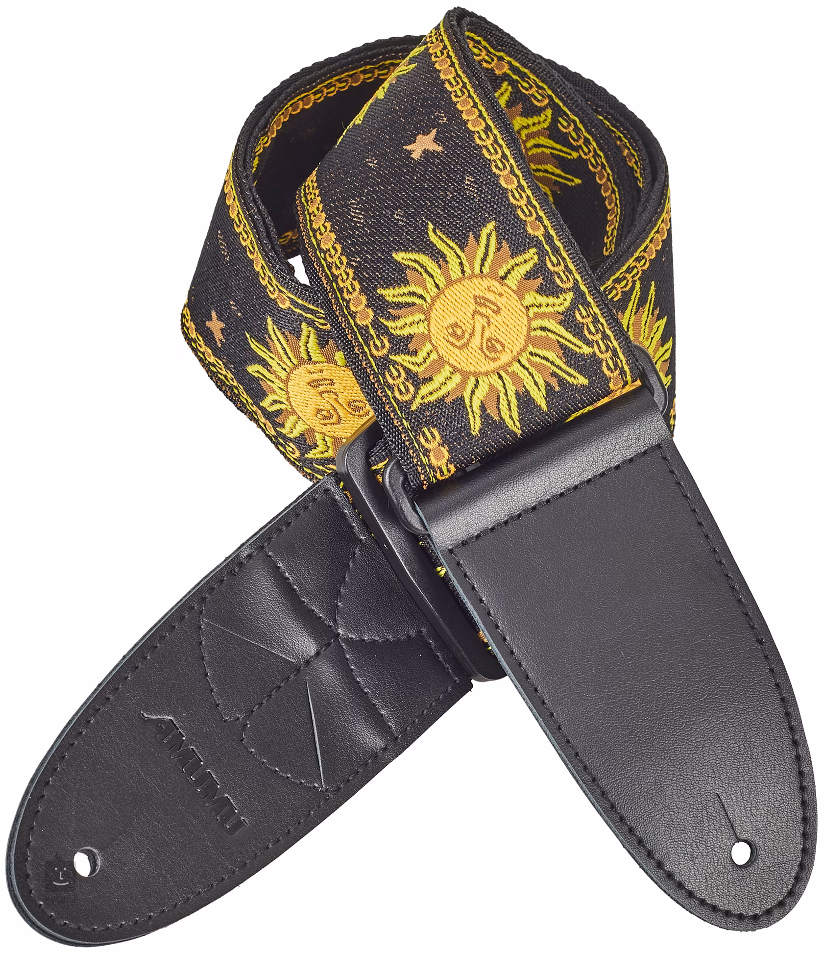 Jacquard Sun Strap Black je popruh vyrobený z odolného nylonu na zadní straně a z polyesteru na straně přední. Délka je nastavitelná a hodí se pro většinu hráčů. Zároveň je díky tomu možné použít tento popruh, kromě kytary a baskytary, například na ukulele nebo mandolínu. Konce jsou z kůže pro kvalitní uchycení nástroje a přední konec disponuje třemi kapsami na trsátka (tři trsátka najdete v balení). Součástí balení je také tkanice pro případ, že by váš nástroj osazen pouze jednou rolnou a gumové zámky, které zabraňují nežádoucímu vyvléknutí. Zdobený je vyšívaným sluncem.