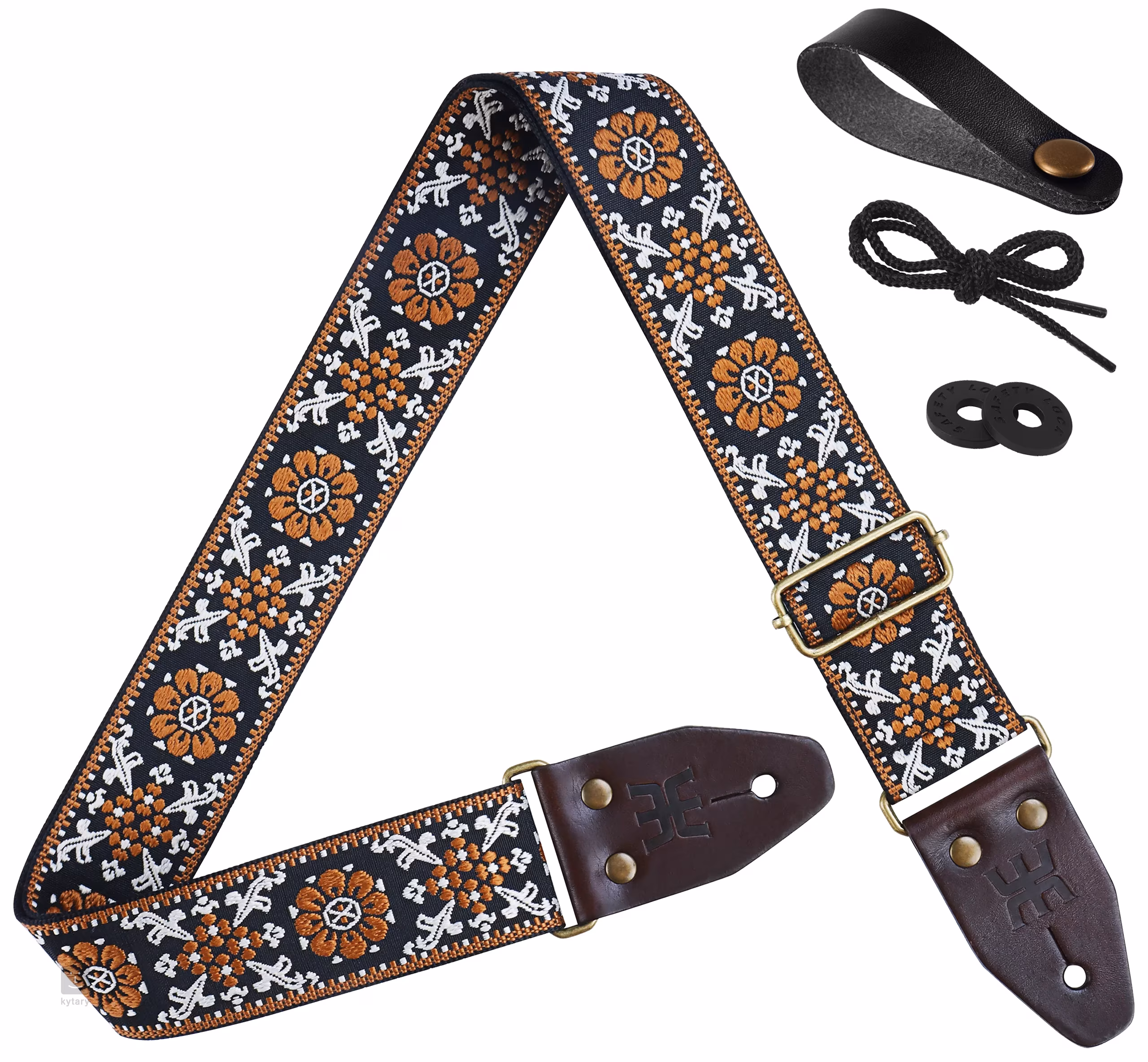 Kytarové popruhy značky AMUMU jsou známé svou odolností, spolehlivostí a kvalitou provedení. Díky široké nabídce modelů a barev si mezi nimi vybere opravdu každý. Popruh Lucky Flower Brown pochází z elegantní vintage edice, která se vyznačuje nádherným vyšívaným vzorem, hnědými koncovkami z pravé kůže a bronzovými sponami pro autenticky zestárlý vzhled. Vyroben je z pohodlného bavlněného materiálu, který je šetrný na kůži a zajišťuje pohodlí i při dlouhém hraní. Koncovky jsou vyrobeny z ultra silné a pevné kůže, která zajišťuje spolehlivé uchycení k nástroji a dlouhou životnost popruhu.