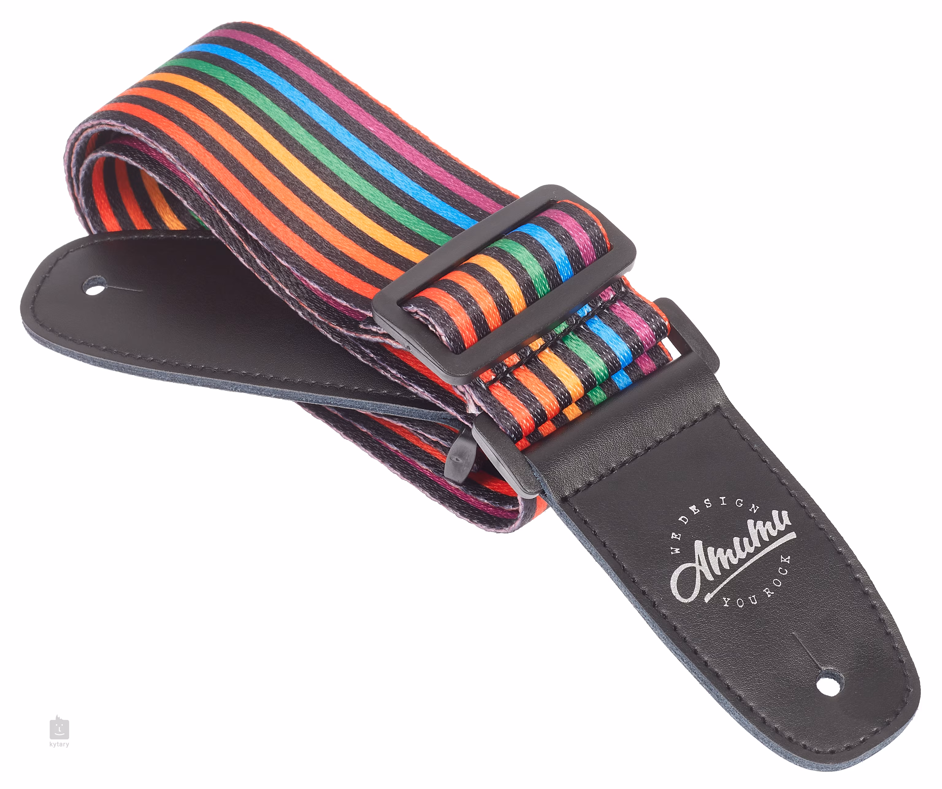 Rainbow Strap je odolný popruh vyrobený z polyesterové bavlny. Délka je nastavitelná a hodí se pro většinu hráčů. Zároveň je díky tomu možné použít tento popruh, kromě kytary a baskytary, například na ukulele nebo mandolínu. Konce jsou z prémiové kůže pro kvalitní uchycení nástroje. Zdobení doplňuje v kůži vyražené logo společnosti.