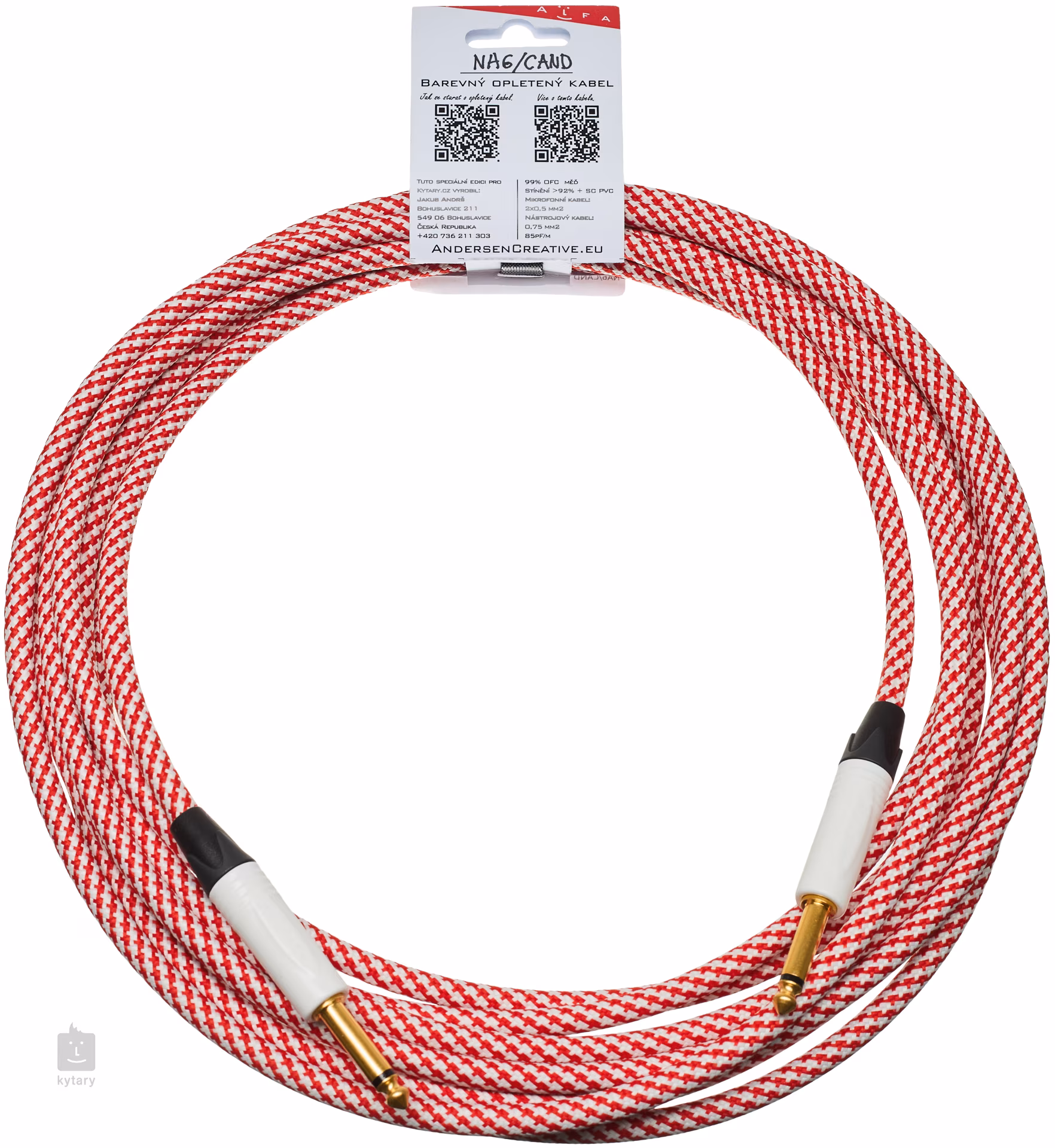 Tento nástrojový kabel značky Andersen Creative byl navržen a vyroben na míru exkluzivně pro Kytary.cz. Jedná se o v Česku vyrobený kabel té nejvyšší kvality, který nenajdete v žádném jiném obchodě. Základem je profesionální jádro značky Bespeco z jejich nejvyšší produktové řady Alpha, které nabízí špičkové přenosové vlastnosti, nízkou kapacitu 85 pF/m (±5 %) a husté stínění (≥ 92 %) doplněné o polovodič z PVC. Díky vodiči o průřezu 1x 0,75 mm² kabel zajišťuje čistý, dynamický a věrný přenos signálu bez zbytečných ztrát.