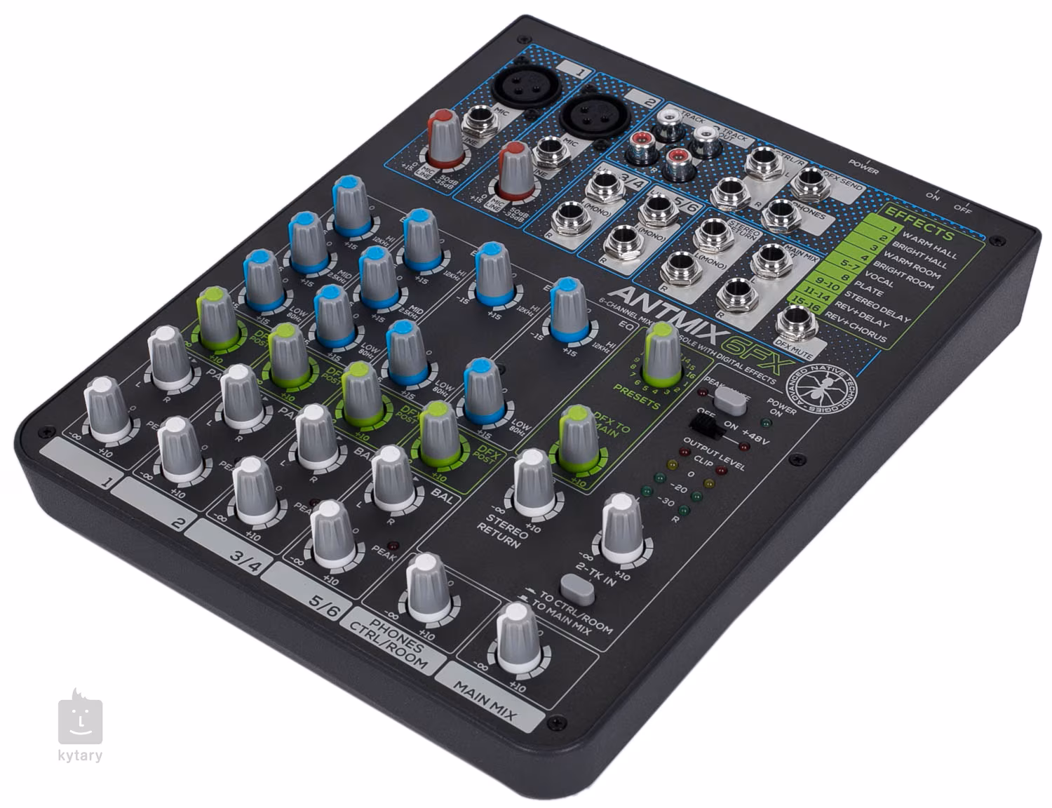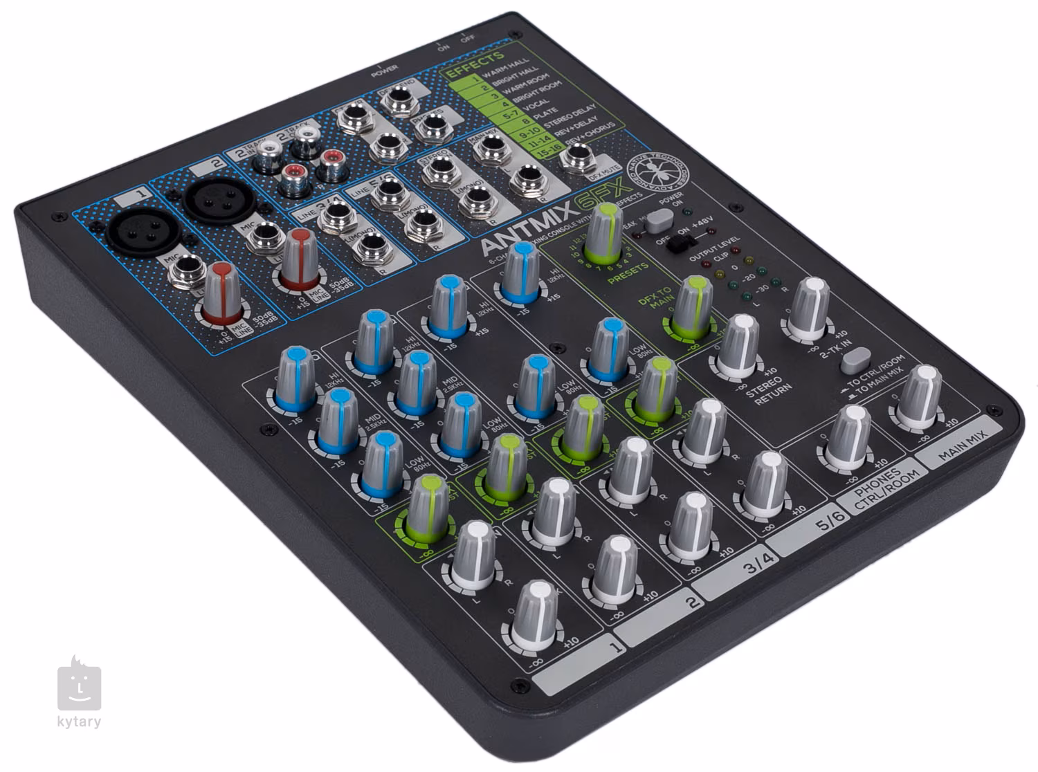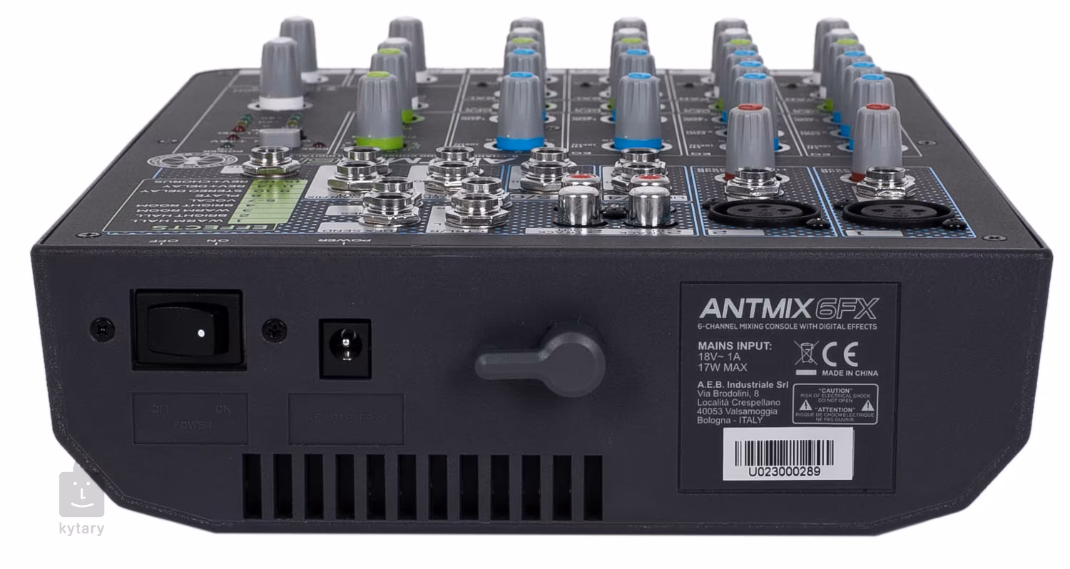 Antmix 6FX je kompaktní mixpult, který ocení jak písničkáři a menší skupiny, tak pořadatelé menších akcí. Pult nabízí dva mikrofonní/linkové vstupy s třípásmovými korekcemi a dva stereo vstupy s 6,3 mm Jacky nebo RCA konektory, na nichž je možné zvuk dobarvit pomocí korekcí výšek a basů.