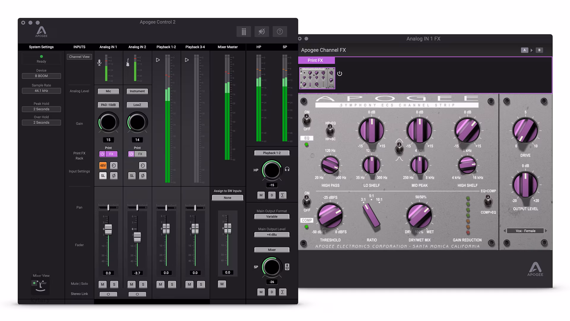 Předzesilovač BOOM dokáže pracovat i s nejnáročnějšími mikrofony jako je Shure SM7B a to až s 62 dB čistého zesílení bez šumu. Sluchátkový zesilovač a převodník DAC studiové třídy si díky zero-ohm výstupu pro sluchátka poradí s čímkoliv od In-Ear monitorů až po sluchátka s vysokou impedancí. Software Apogee Control 2 poskytuje kompletní přístup ke všem funkcím a vlastnostem BOOM včetně Symphony ECS Channel Strip FX, který běží na vestavěném hardwarovém DSP. Získejte vřelost analogového zařízení pomocí třípásmového ekvalizéru, kompresoru a Drive.