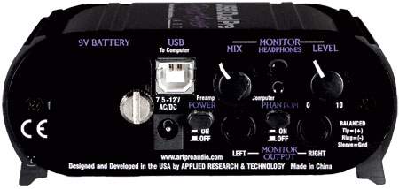 For monitoring, an 1/8-inch TRS mini headphone jack with level and monitor mix controls on the rear allow for latency free local monitoring of the inputs while recording as well as playback monitoring of the USB bus. The monitor mix is also routed to the 1/4-inch TRS balanced outputs. This lets you use the 1/4-inch outputs as either preamplifier outputs or as the monitor feed to your powered monitors.