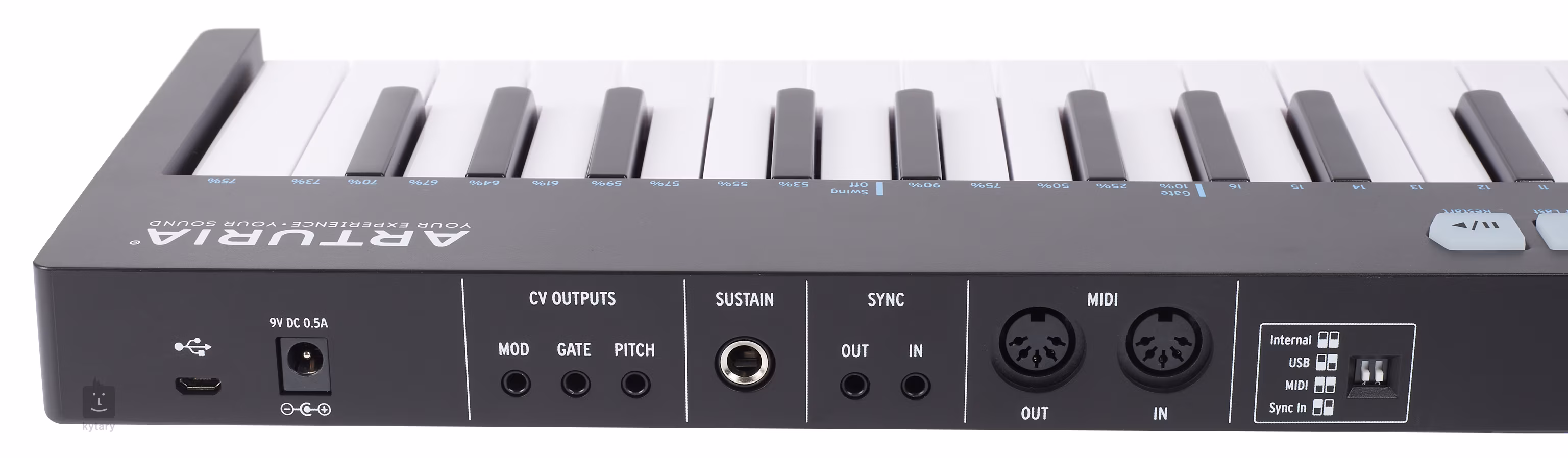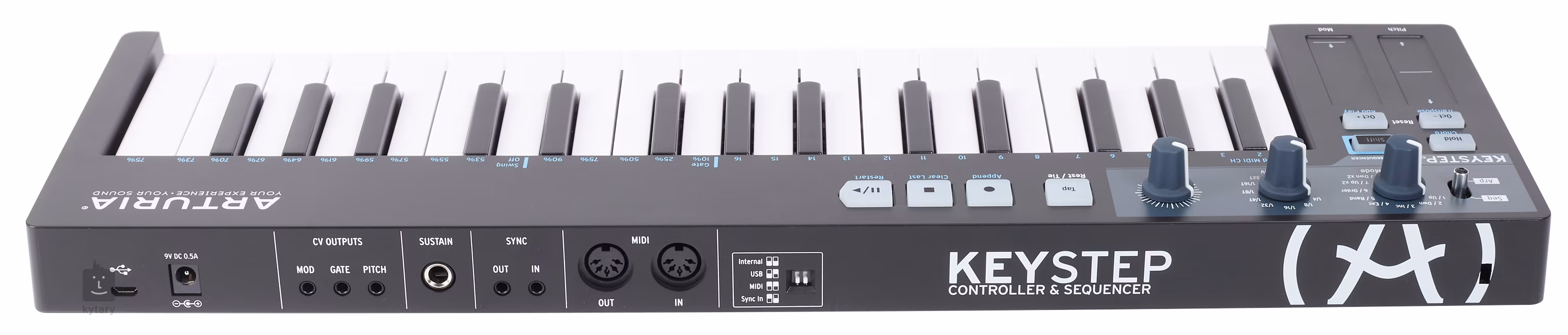 Co činí Keystep jedinečným kontrolérem je jeho rozšířená konektivita. Kromě standardního USB najdete i vstup a výstup pro MIDI, jacky pro synchronizaci hodin, DIN sync jacky, CV/Gate výstupy a samostatný CV výstup, kterému lze přiřadit ovladač Mod, dynamiku klaviatury nebo aftertouch. V praxi to znamená, že pomocí Keystepu můžete ovládat nejen software, ale i celou sbírku analogových syntezátorů a modulů, synchronizovat MIDI zařízení etc. USB port při připojení k počítači kontrolér nabíjí, pokud ho chcete používat samostatně, můžete připojit adaptér.