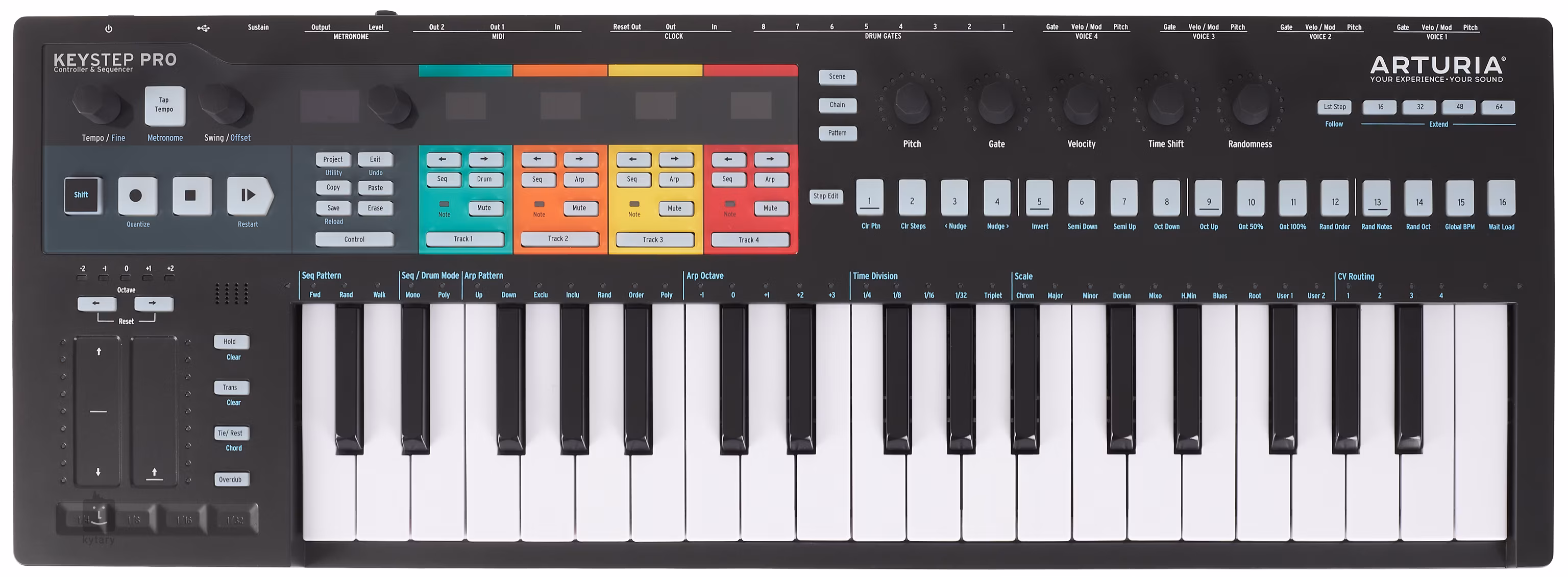 Keystep Pro má 37 dynamicky citlivých Slim kláves s aftertouchem, jejichž velikost byla pečlivě vysoustružena tak, abyste při své hře nemuseli nic obětovat, ale nástroj si zachoval kompaktní rozměry. Každá klávesa navíc obsahuje LED diodu pro lepší orientaci.