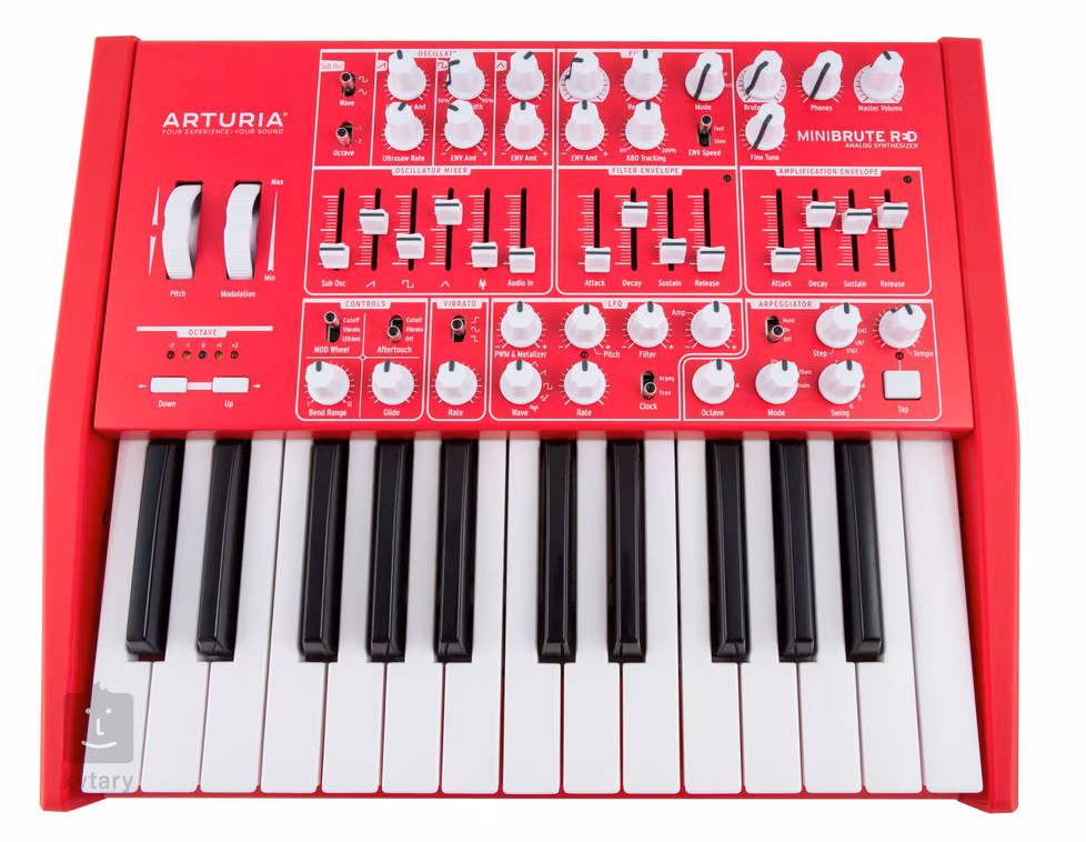 Arturia MiniBrute je syntezátor se stoprocentně analogovým okruhem, díky čemuž vám nabídne typicky vřelý zvuk známý z vintage nástrojů. Vytvořte tlustou basu nebo ječící melodickou linku. Nic není problém. Samozřejmostí je přítomnost řady filtrů a oscilátorů včetně dvou LFO, Steiner-Parker Multimode filtru nebo sub oscilátoru, takže můžete kroutit a modulovat jak diví. Nechybí pochopitelně ani arpeggiator, dvě ADSR obálky, kolečka pro modulaci a pitch bend i 25 polovyvážených kláves s aftertouchem. Pro komunikaci s dalšími periferiemi výrobci nezapomněli na CV vstupy MIDI I/O a MIDI USB a dokonce ani na audio vstup, takže pomocí MiniBrute můžete modulovat i externí signál. Ať už jsou vaše ambice v EDM nebo jiném žánru jakékoliv, tento analogový syntezátor rozhodně otevře stavidla vaší kreativity.
