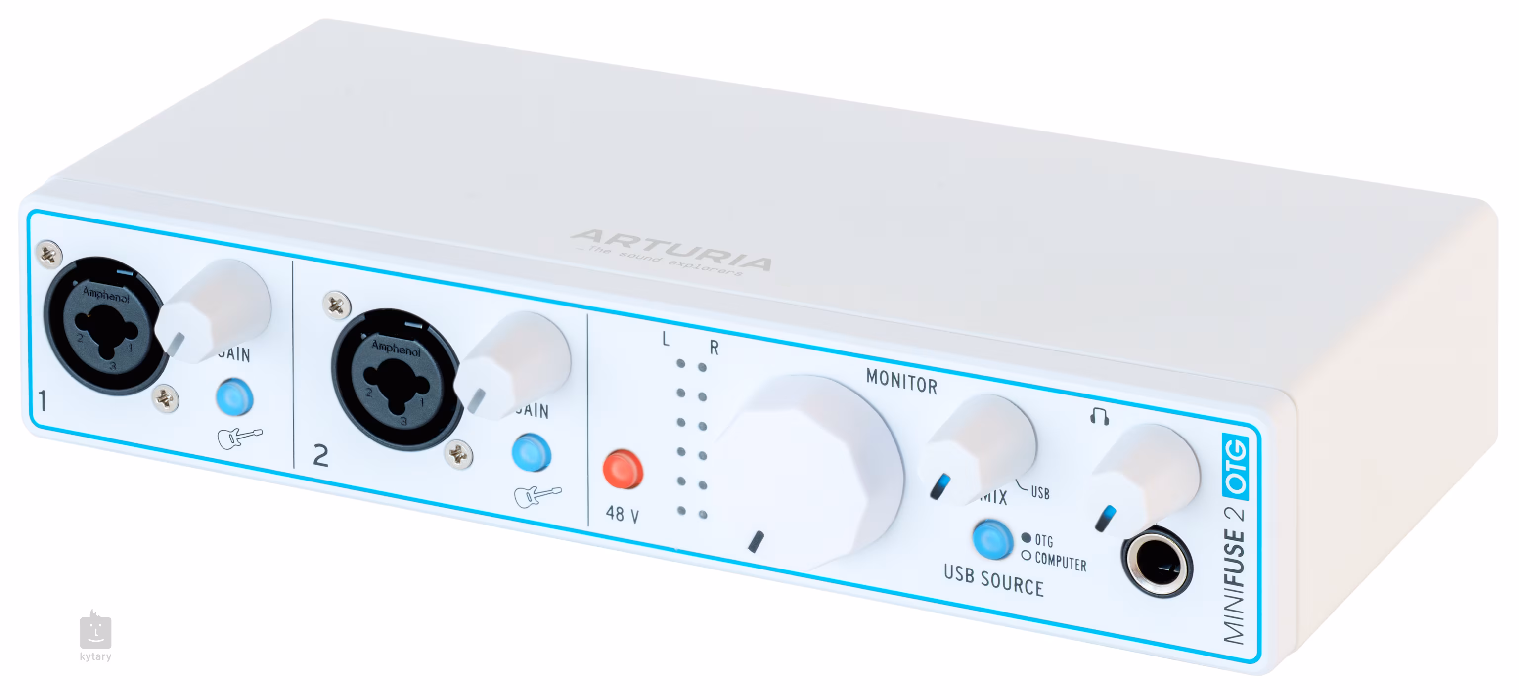 Zásadní výhodou modelu MiniFuse 2 OTG je OTG USB port, který dovoluje přímé připojení iPhonu, iPadu, Android zařízení nebo druhého počítače. Rozhraní je kompatibilní se vzorkovacími frekvencemi 44,1 a 48 kHz a lze jej napájet i z powerbanky, což z něj dělá ideální mobilní nahrávací studio. Praktickým bonusem je také USB-A hub pro připojení MIDI kontroleru nebo jiného USB zařízení.