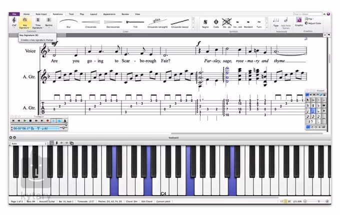 Pokud studenti dávají přednost klaviatuře pro učení se a psaní not, mohou využít virtuální klaviaturu. Jednoduše kliknou myší na klávesu pro zapsání noty a akordu nebo mohou využít klávesnici počítače s vnořenou klaviaturou na klávesách QWERTY. Při přehrávání partitury virtuální klaviatura animuje právě přehrávané tóny, klávesy.