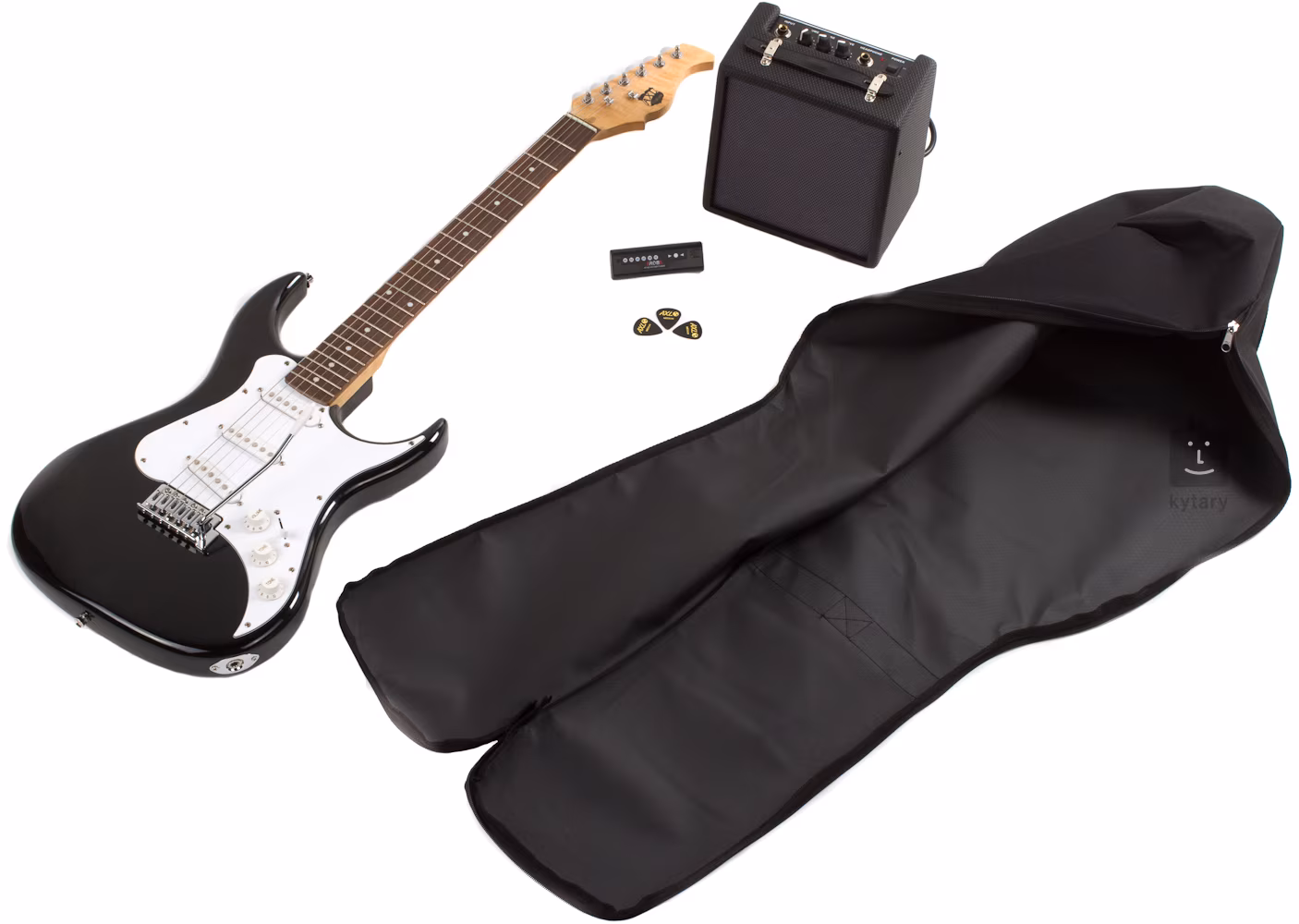 Kytarová sada vhodná pro začínající muzikanty, obsahující kytaru, kombo a příslušenství.