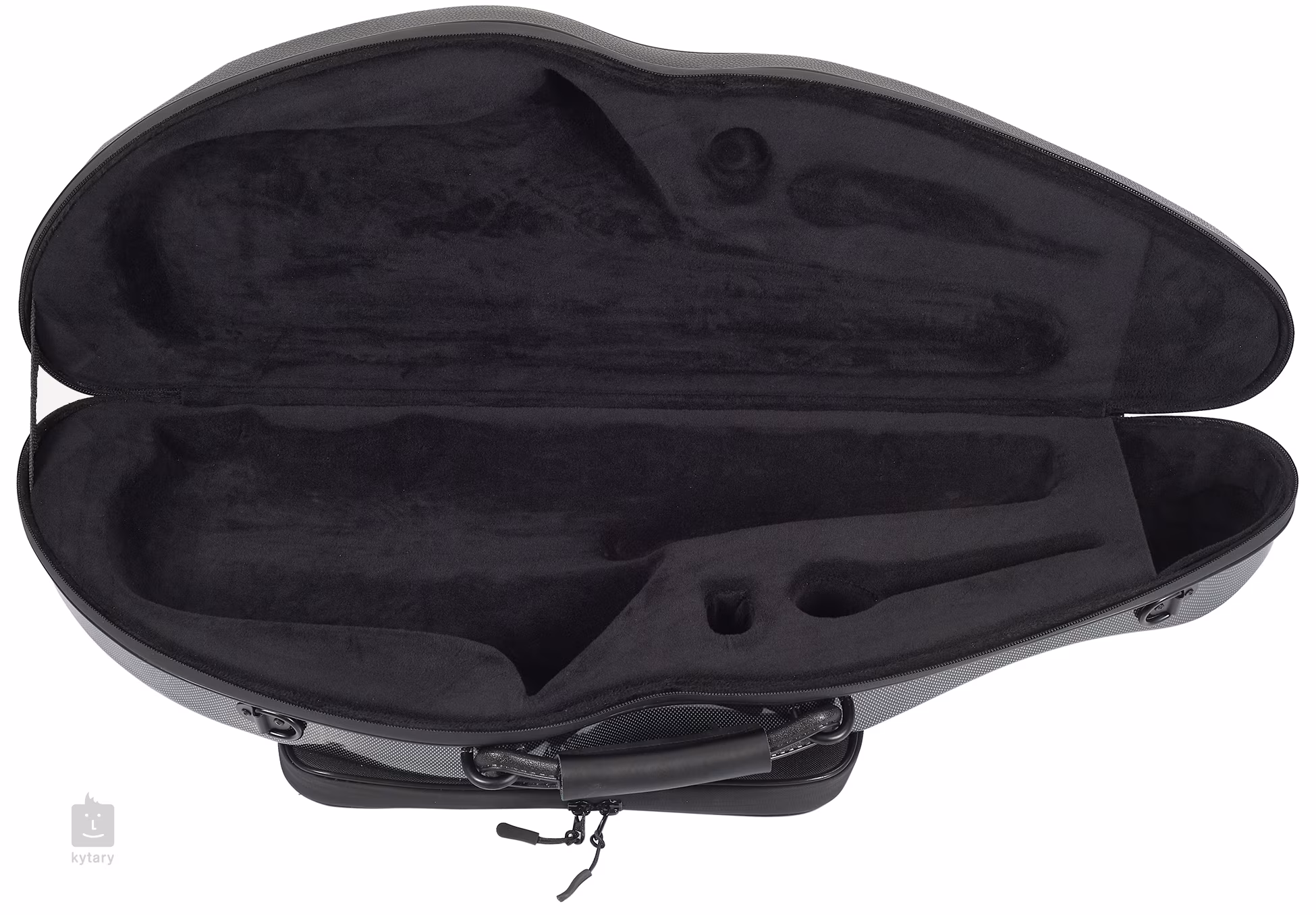 Kufr na altový saxofon zhotovený z kompozitního materiálu (karbonových vláken). Příslušenství uložíte do odděleného pouzdra z umělé textilie. K manipulaci s kufrem lze použít madlo s koženým potahem.