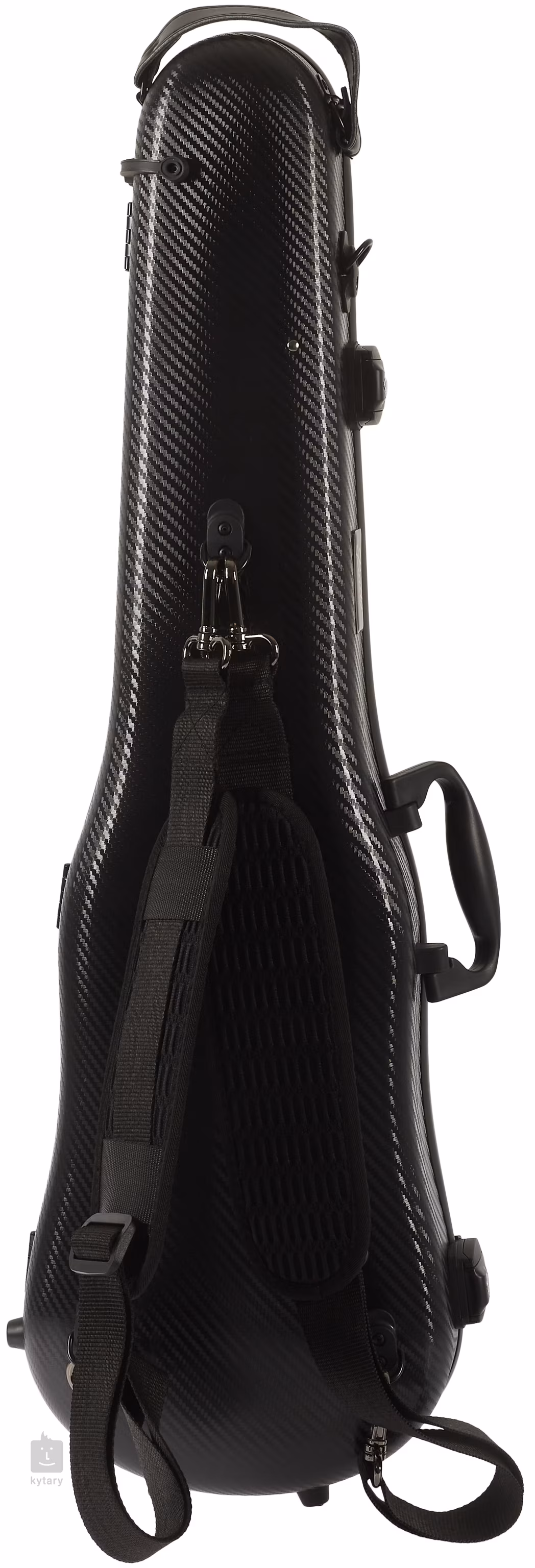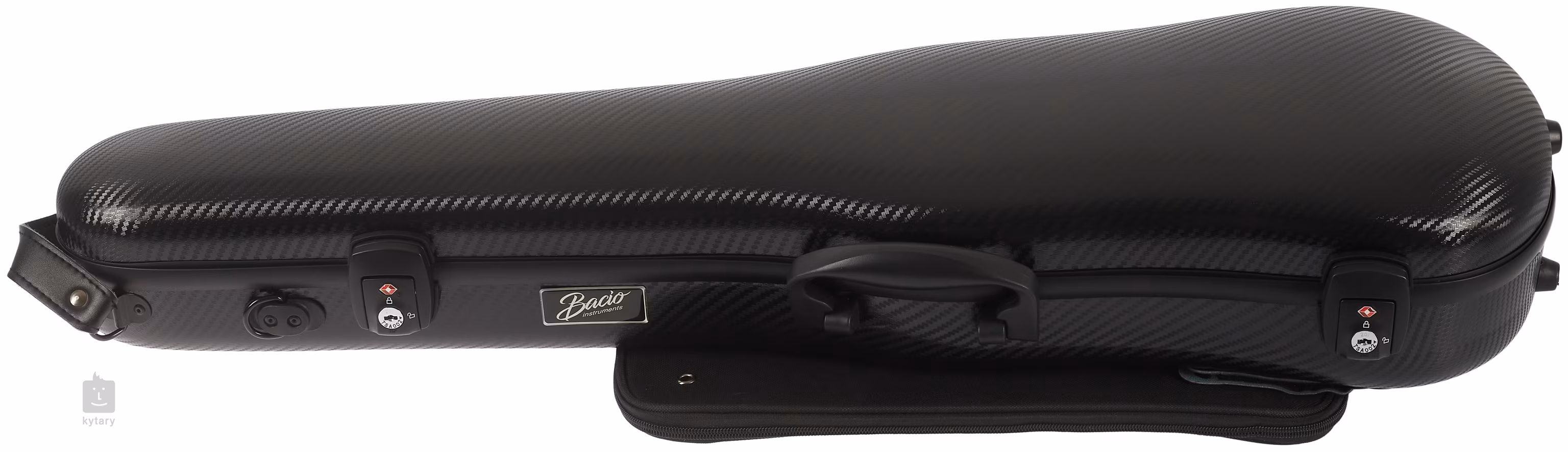 Pouzdro na housle zhotovené z karbonového kompozitu se dvěma zámky a odemykáním na kód/heslo, odnímatelnou kapsou na noty, držadly po stranách i na horní straně, dvěma popruhy na ramena a dvěma držáky pro smyčce.