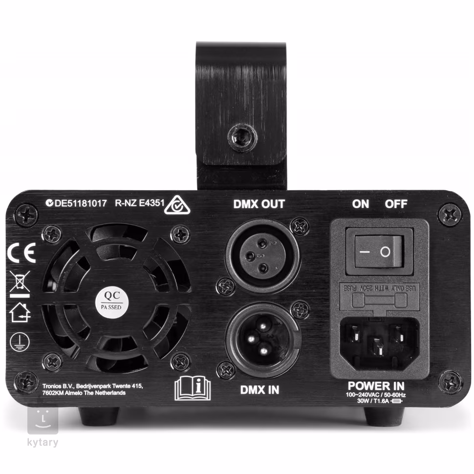 Přístroj je osazen 3pinovými DMX konektory. Součástí balení je IR ovladač a montážní držák pro montáž na nosnou konstrukci.