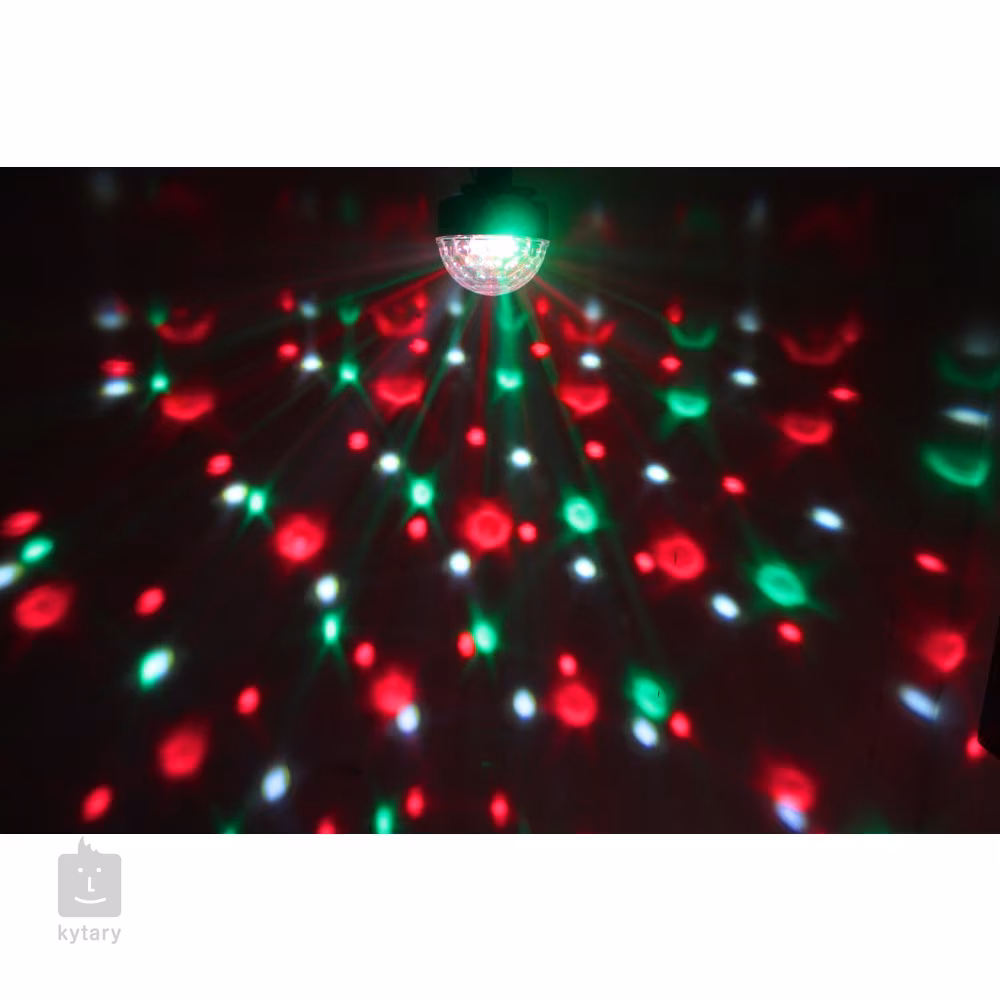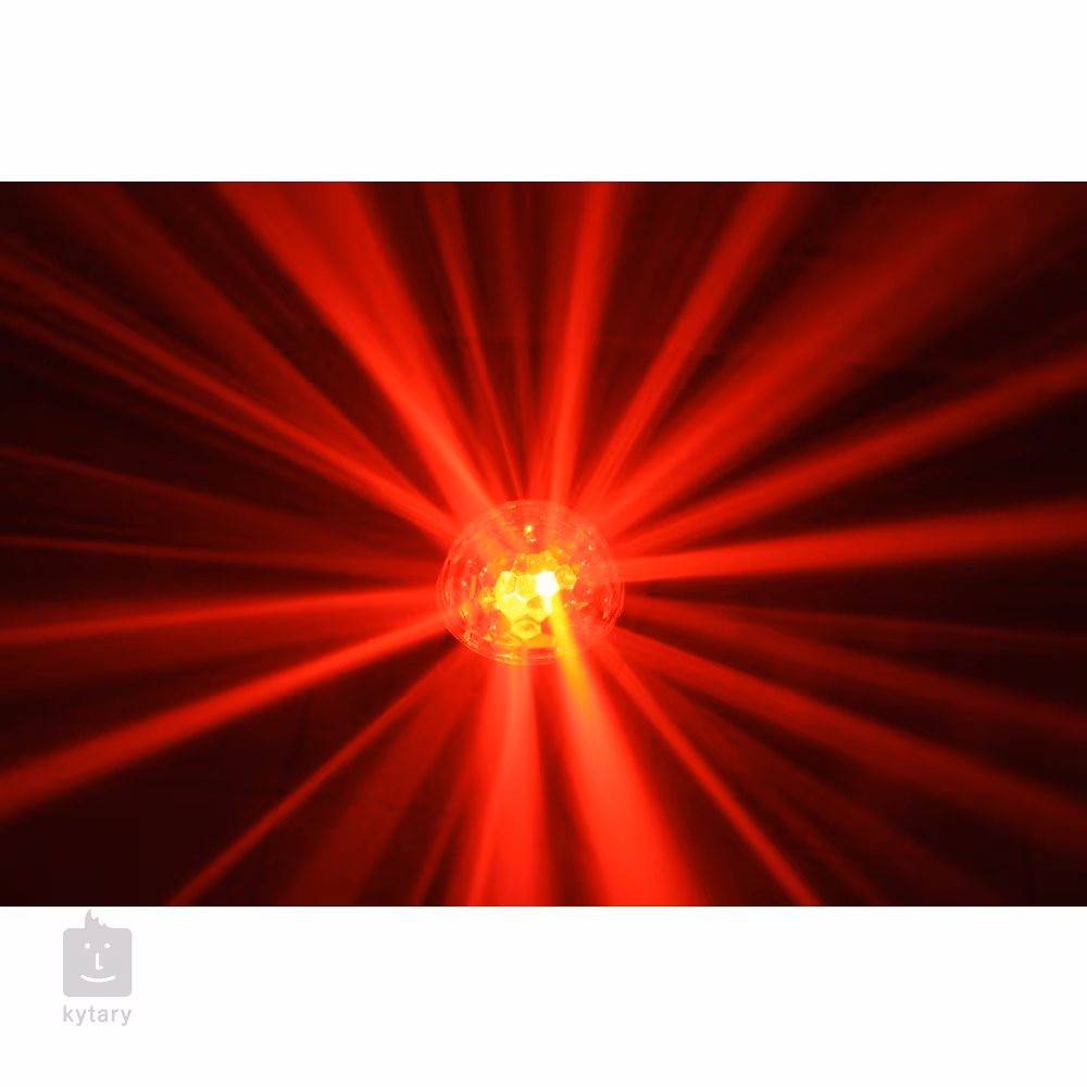 LED paprskový efekt Mini Star Ball 6x 3W RGBAWP od společnosti BeamZ je ideální zejména pro domácí večírky a jiné menší prostory. Jeho světelný zdroj tvoří šest 3W LED diod typu RGBAWP (Red, Green, Blue, Amber, White, Purple), které jsou uzavřeny v transparentní paprskové kupoli. Ta do prostoru vysílá silné barevné paprsky, které rotují kolem centrální osy efektu a vytváří kruhové obrazce. Efekt lze ovládat buď v automatickém nebo zvukovém režimu – při ovládání zvukem lze nastavit citlivost mikrofonu. K dispozici je také dálkové ovládání prostřednictvím infračerveného ovladaček, který je součástí balení.