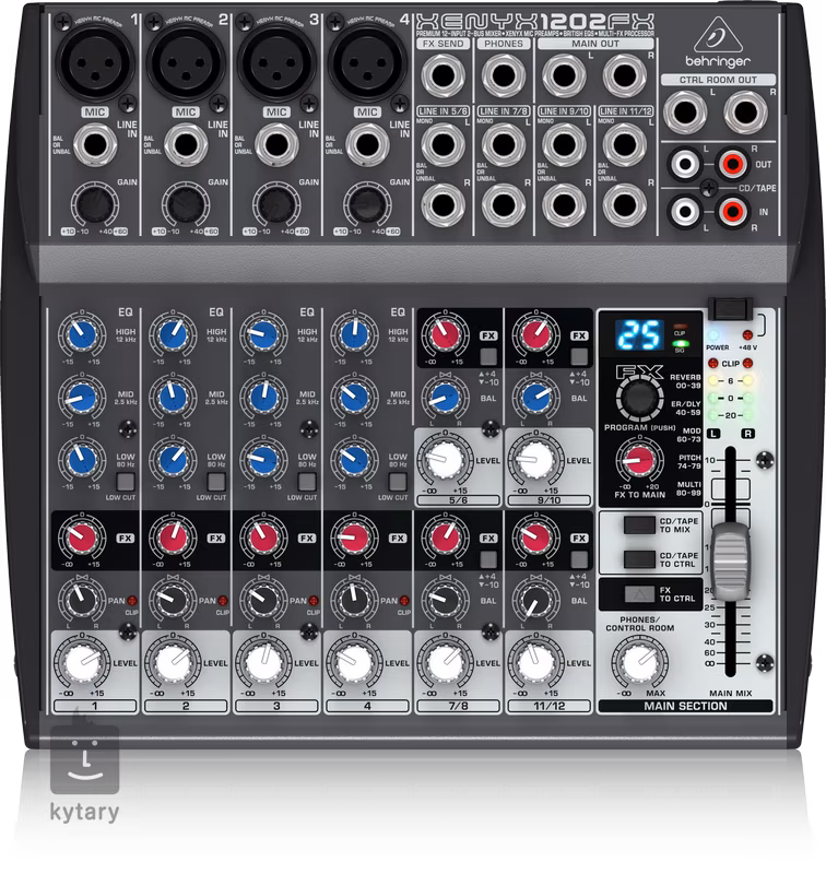 XENYX 1202FX je mixážní pult s efektovou jednotkou, čtyřmi mikrofonními/linkovými vstupy a čtyřmi stereo kanály, které lze také využít jako return pro externí efektové procesory. Mikrofonní kanály mají třípásmové korekce, na všech kanálech se pak nachází knob pro poslání zvuku do efektového procesoru (FX send) a ovladač gainu a panoramy. Výsledný mix lze nasměrovat do hlavního výstupu, kontrolní místnosti (včetně efektů), sluchátek nebo externího záznamového zařízení.