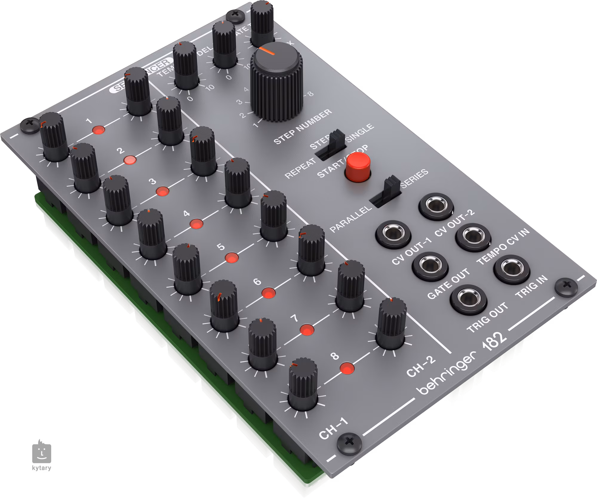 Modul 182 SEQUENCER nabízí pro každý krok nastavení řídicího napětí pomocí knoflíku a globální ovládání tempa, zpoždění a délky tónu (gate time). Přepínač kroku umožňuje sekvence s délkou 1 až 16 kroků a režim opakování nebo jednorázového přehrávání. Sekvencer lze taktovat externě pomocí CV a spouštět tlačítkem start/stop.