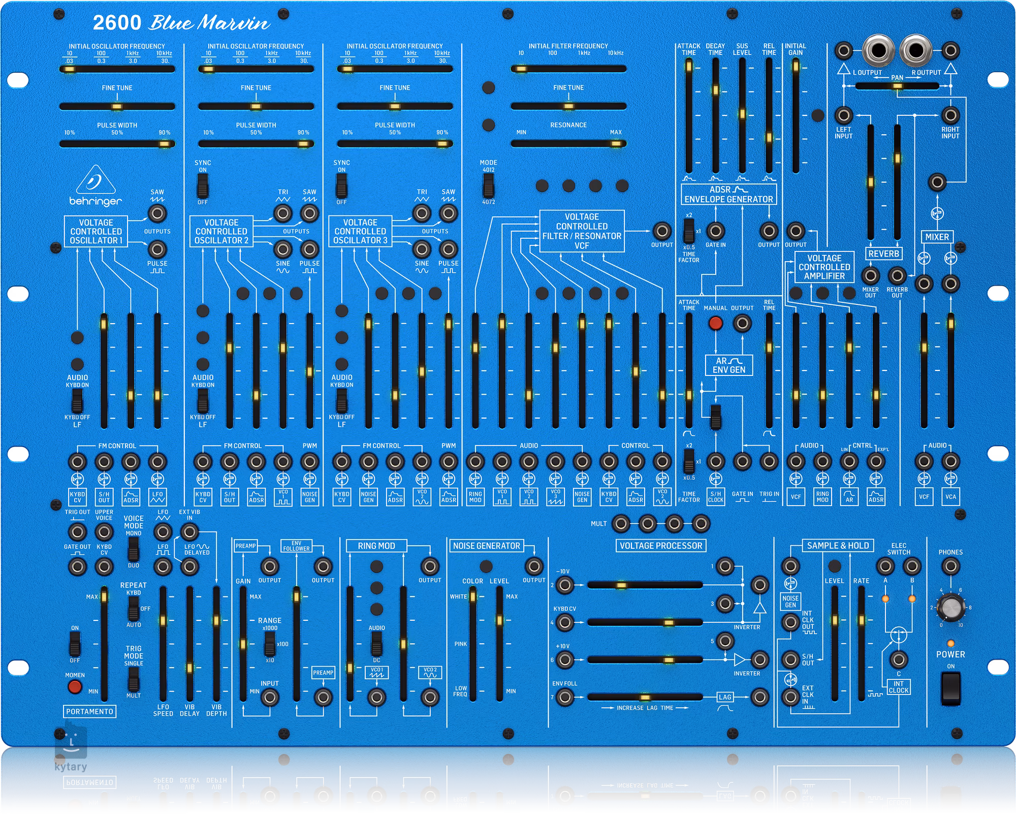 Behringer 2600 BLUE MARVIN nabízí 3 VCO, multi-mode VCF a pružinový reverb v 8U rackovém formátu. Autentická reprodukce obvodů ARP Grey Meanie ze 70. let s pečlivě vybranými operačními zesilovači a tranzistory, semi-modulární architektura pro okamžité hraní, 3 VCO s režimem LFO, vstupy FM a více výstupy vlnových tvarů, multi-mode VCF s vyhrazeným low-pass výstupem a přepínatelným high/notch výstupem, široká škála modulů včetně ring modulátoru, lag procesoru, sample & hold, Schmitt triggeru a envelope follower, ADSR a AR generátory obálek s přepínatelným časovým faktorem, mechanický pružinový reverb, noise generátor s plynule proměnlivou barvou, 2 vyhrazené LFO s pulzními a sinusovými výstupy, přepínatelná možnost Post Filter Distortion (PFD) / Inverter na voltage procesoru, diferenciální (+/-) vstup VCA s lineárními a exponenciálními řídicími vstupy, další funkce včetně atenuátoru, mixéru, invertoru, slew rate limiteru a 4-cestného multiple pro kreativní patching, externí audio vstup pro zpracování externích zvukových zdrojů, 78 ovládacích prvků pro přímý a real-time přístup ke všem parametrům, 93 patchovatelných vstupů/výstupů pro maximální flexibilitu konfigurace a komplexní implementace MIDI s výběrem MIDI kanálu a priority hlasu.