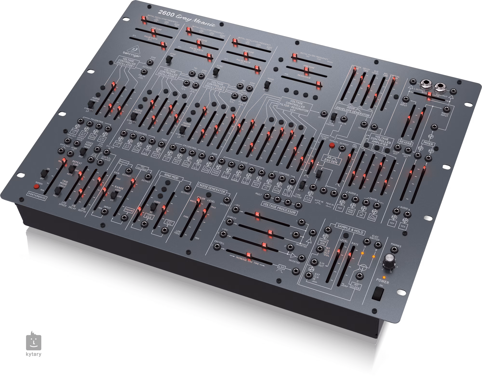 Behringer 2600 GRAY MEANIE nabízí 3 VCO, multi-mode VCF a pružinový reverb v 8U rackovém formátu. Autentická reprodukce obvodů ARP Grey Meanie ze 70. let s pečlivě vybranými operačními zesilovači a tranzistory, semi-modulární architektura pro okamžité hraní, 3 VCO s režimem LFO, vstupy FM a více výstupy vlnových tvarů, multi-mode VCF s vyhrazeným low-pass výstupem a přepínatelným high/notch výstupem, široká škála modulů včetně ring modulátoru, lag procesoru, sample & hold, Schmitt triggeru a envelope follower, ADSR a AR generátory obálek s přepínatelným časovým faktorem, mechanický pružinový reverb, noise generátor s plynule proměnlivou barvou, 2 vyhrazené LFO s pulzními a sinusovými výstupy, přepínatelná možnost Post Filter Distortion (PFD) / Inverter na voltage procesoru, diferenciální (+/-) vstup VCA s lineárními a exponenciálními řídicími vstupy, další funkce včetně atenuátoru, mixéru, invertoru, slew rate limiteru a 4-cestného multiple pro kreativní patching, externí audio vstup pro zpracování externích zvukových zdrojů, 78 ovládacích prvků pro přímý a real-time přístup ke všem parametrům, 93 patchovatelných vstupů/výstupů pro maximální flexibilitu konfigurace a komplexní implementace MIDI s výběrem MIDI kanálu a priority hlasu.
