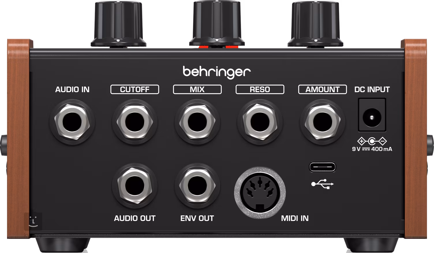 Zadní panel efektu vám pak poskytne velmi bohatou konektivitu. Kromě mono vstupu a mono výstupu pro vedení nástrojového signálu je k dispozici řada konektorů pro připojení externích expression pedálů a VC kontrolerů pro ovládání parametrů Cutoff, Mix, Resonance a Amount. Dále zde najdete výstup Env Out pro vedení obálkou upraveného signálu do dalších ovládacích zařízení a k dispozici je také 5pinový MIDI vstup pro připojení externího MIDI kontroleru. Sadu konektorů zakončuje USB port, s jehož pomocí můžete efekt připojit k dedikované aplikaci Guitar Tribe, která vám umožní editovat parametry nebo aktualizovat firmware. K napájení krabičky poslouží standardní 9V adaptér (není součástí balení). Veškerá elektronika je zasazena v bytelném kovovém šasi, které je po stranách lemováno elegantním dřevěným okrajem.