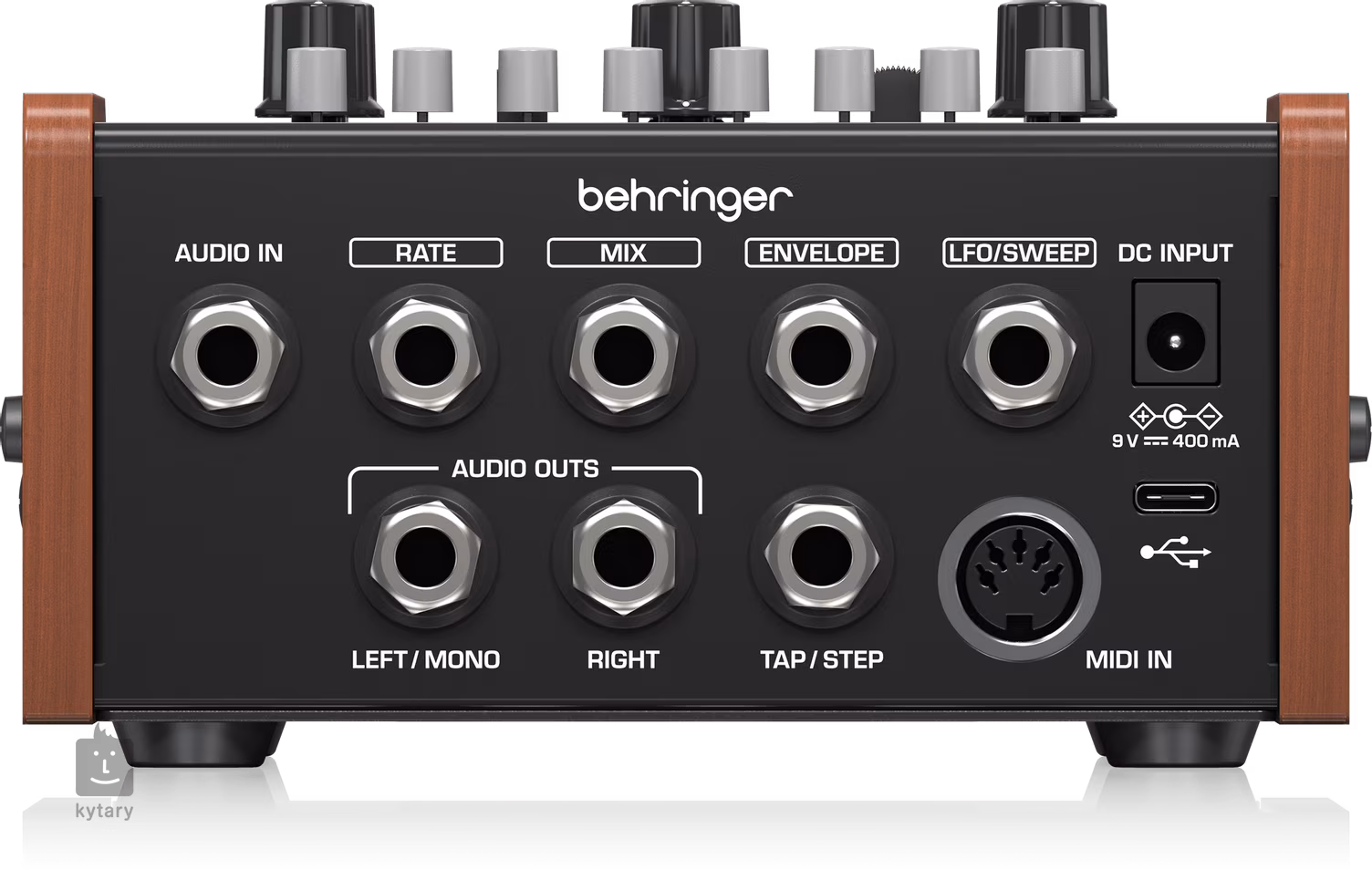 Zadní panel krabičky je vybaven bohatou konektivitou. Kromě jednoho mono vstupu a dvou výstupů pro vedení stereo signálu, je vybaven pěti vstupy pro externí expression pedály, kterými budete moci ovládat parametry Rate, Mix, Envelope, LFO/Sweep a Tap/Step. K dispozici je také 5pinový MIDI vstup pro připojení externího MIDI kontroleru a USB port, s jehož pomocí můžete efekt připojit k dedikované aplikaci Guitar Tribe, která vám rovněž umožní editovat parametry nebo aktualizovat firmware. K napájení krabičky poslouží standardní 9V adaptér (není součástí balení). Veškerá elektronika je zasazena v bytelném kovovém šasi, které je po stranách lemováno elegantním dřevěným okrajem.