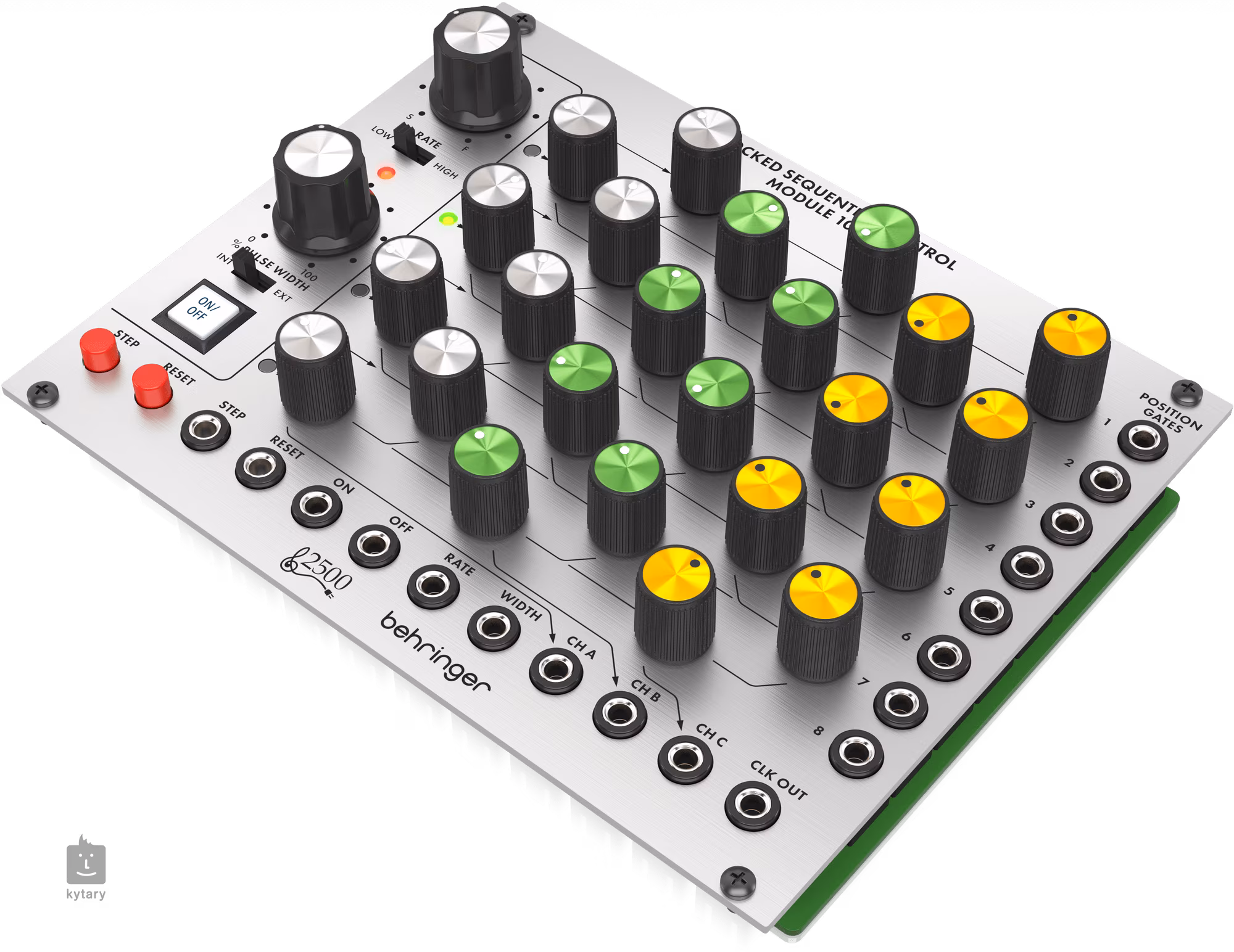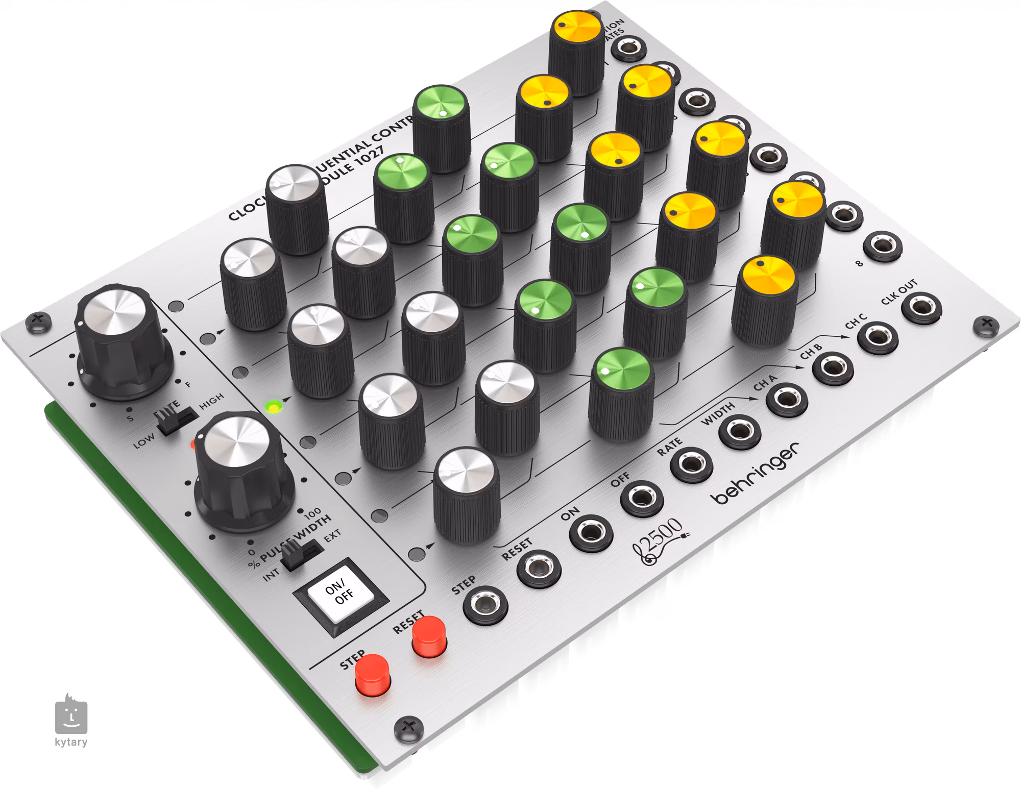 Modul Behringer 1027 CLOCKED SEQUENTIAL CONTROL MODULE obsahuje integrovaný 8-krokový čítač a 3 kanály (A, B a C) řídicích napětí. Každý krok má 3 nezávisle nastavitelné výstupy napětí. Vestavěný generátor časové základny umožňuje automatický posun sekvenceru. Rychlost interních hodin lze nastavit od 20 kroků za minutu do 400 kroků za sekundu. Modul nabízí vstup pro externí taktování, tlačítko pro spuštění/zastavení interních hodin, ovládání šířky pulzu a 8 výstupů gate.