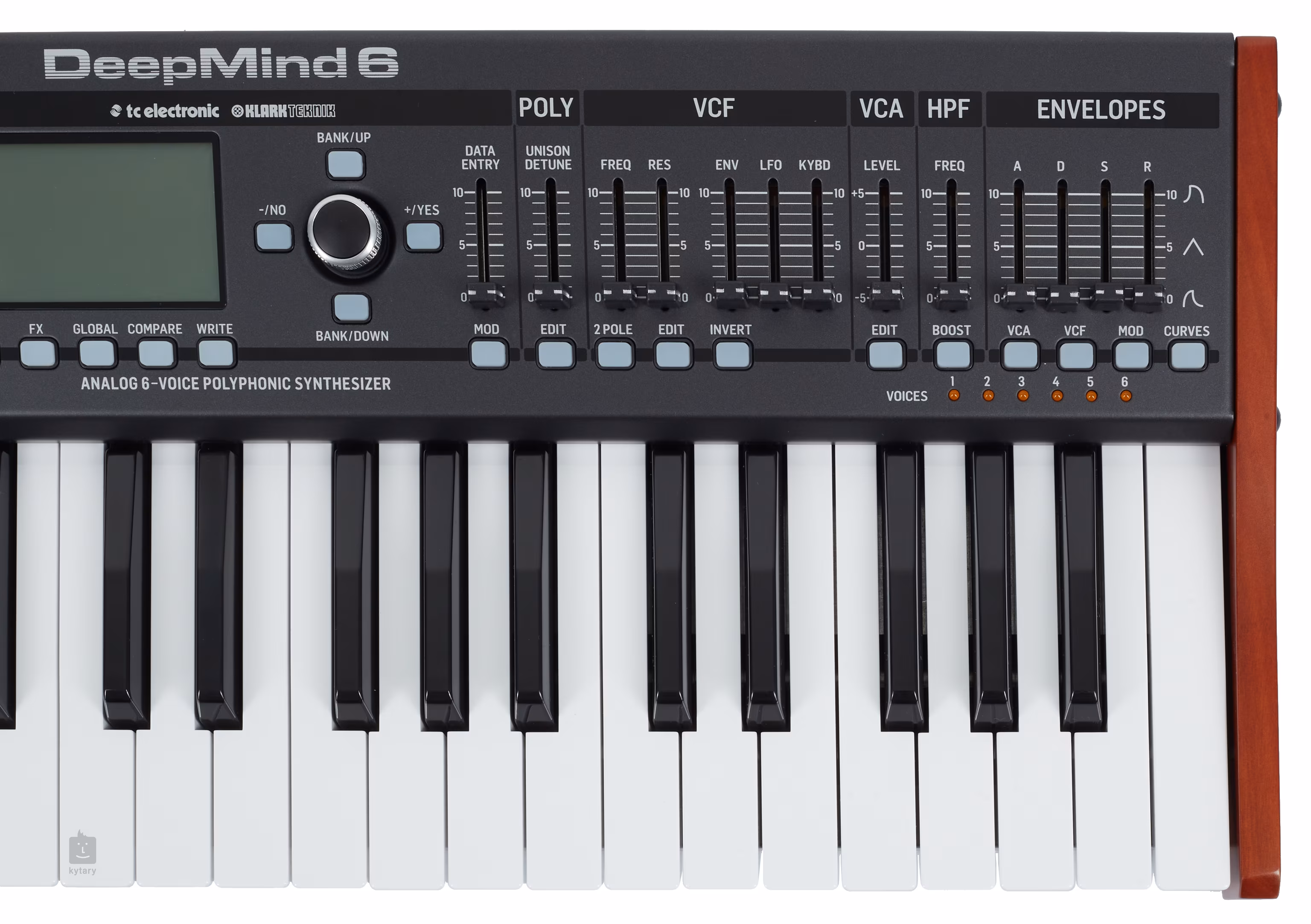 DeepMind 6 je unikátní analogový syntezátor s šestihlasou polyfonií a polovyváženou klaviaturou s 37 klávesami. Součástí jeho výbavy jsou dva oscilátory, dva LFO, tři ADSR generátory, sekvencér o 32 krocích, arpeggiator a osmikanálový modulační matrix. Zkrátka vše, co by v analogovém syntezátoru nemělo chybět.