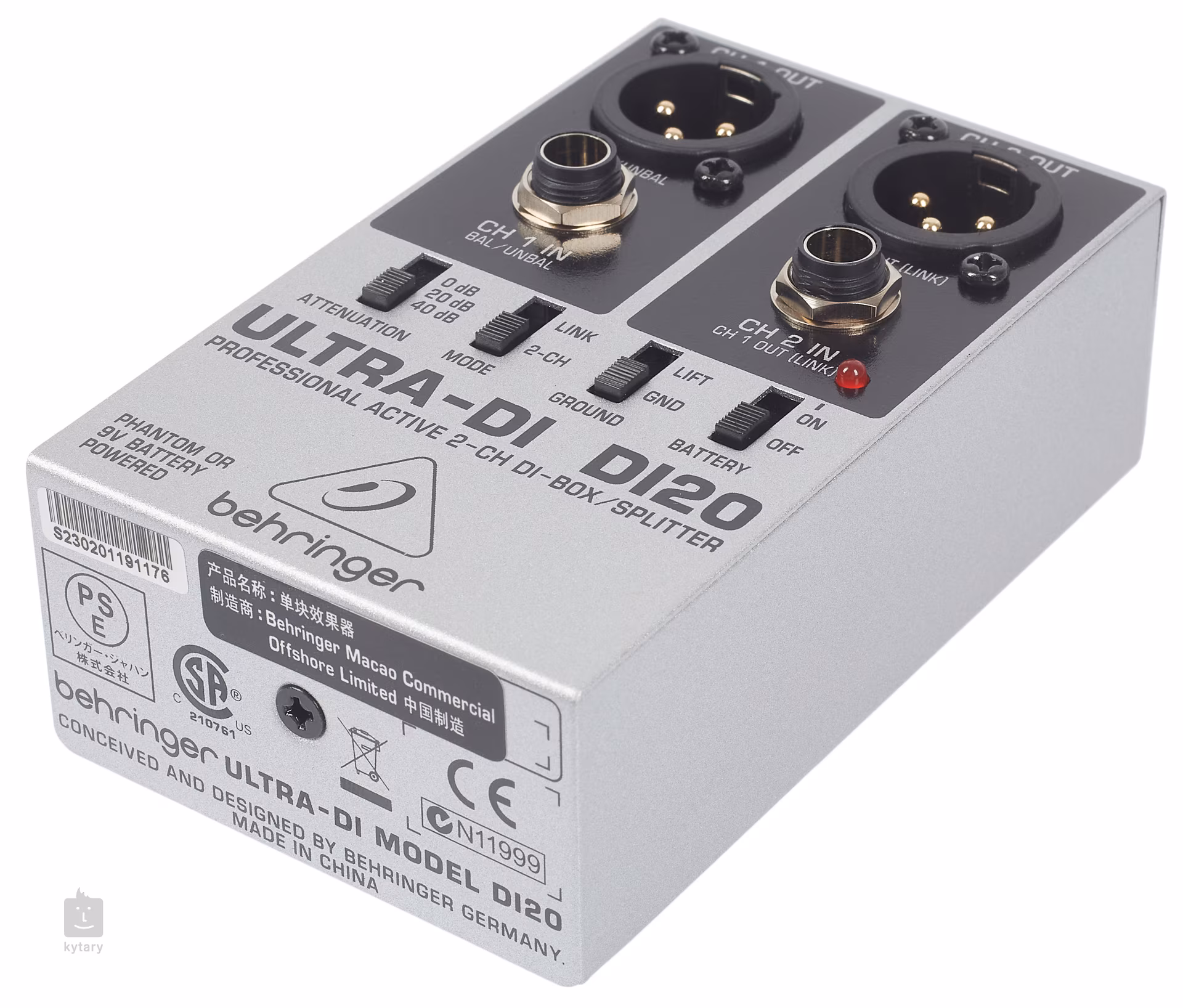 Behringer DI20 je dvoukanálový aktivní DI box, kterým změníte signál ze dvou nesymetrických vstupů (2x jack 6,3 mm) na symetrický (2x XLR), nebo jej můžete použít jako signálový rozdělovač. Nabízí volitelnou atenuaci výkonu 0 dB/-20 dB/-40 dB, přepínatelné uzemnění a napájení 9V baterií nebo pomocí fantomového napájení.