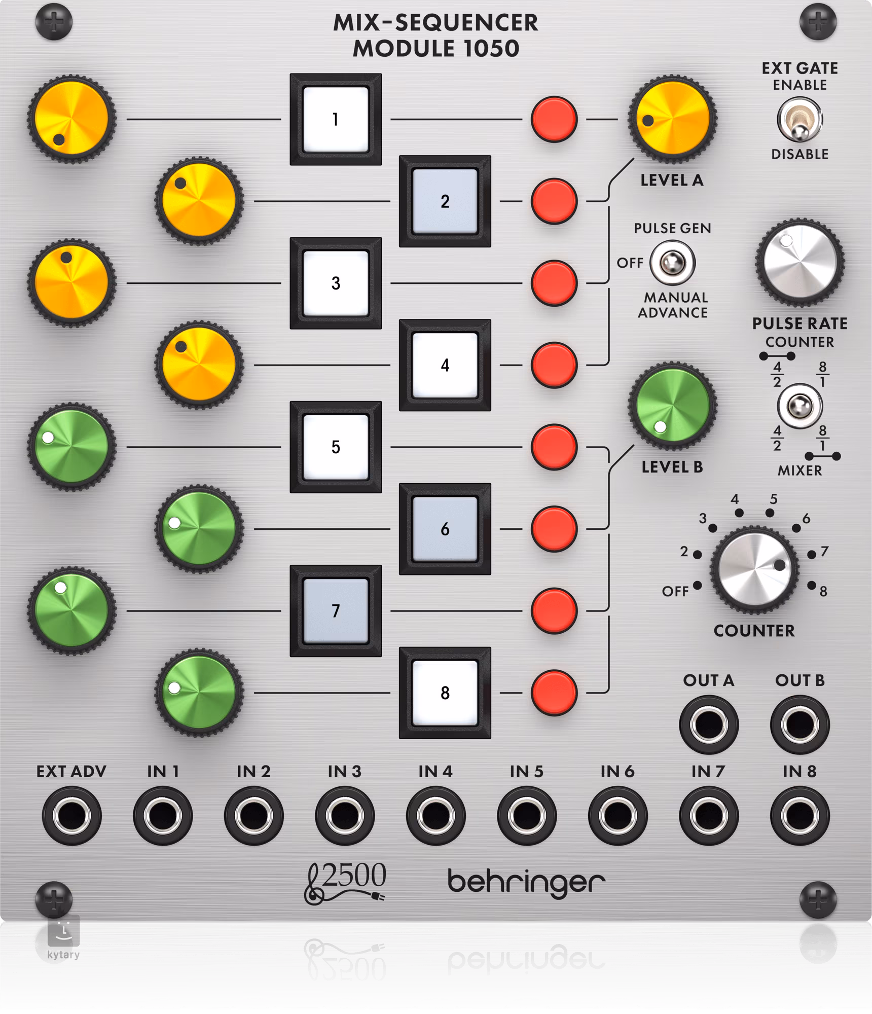 Modul MIX-SEQUENCER MODULE 1050 od Behringer je věrnou replikou původního systému „System 2500“ ze 70. let. Tento modul je navržen pro použití v Eurorack systémech a nabízí autentický analogový zvuk díky originální topologii. MIX-SEQUENCER MODULE 1050 umožňuje rychlý výběr signálů prostřednictvím klasického mix formátu, funguje jako 8 kanálový mixer nebo sekvencer, kde každý audio vstup má svůj vlastní attenuator, potenciometr a tlačítko on/off. Tento modul umožňuje flexibilní řízení a mixování signálů s jednoduchým ovládáním. Když se používá jako sekvencer, můžete volit mezi jedním 8 krokovým nebo dvěma 4 krokovými sekvencery, což přináší maximální flexibilitu pro tvorbu hudby. Potenciometry jsou také prakticky rozlišeny dvěmi barvami podle dvou skupin. Každý kanál má také tlačítko Exclusive-On, které umožňuje aktivaci pouze jednoho kanálu a ztlumení ostatních.